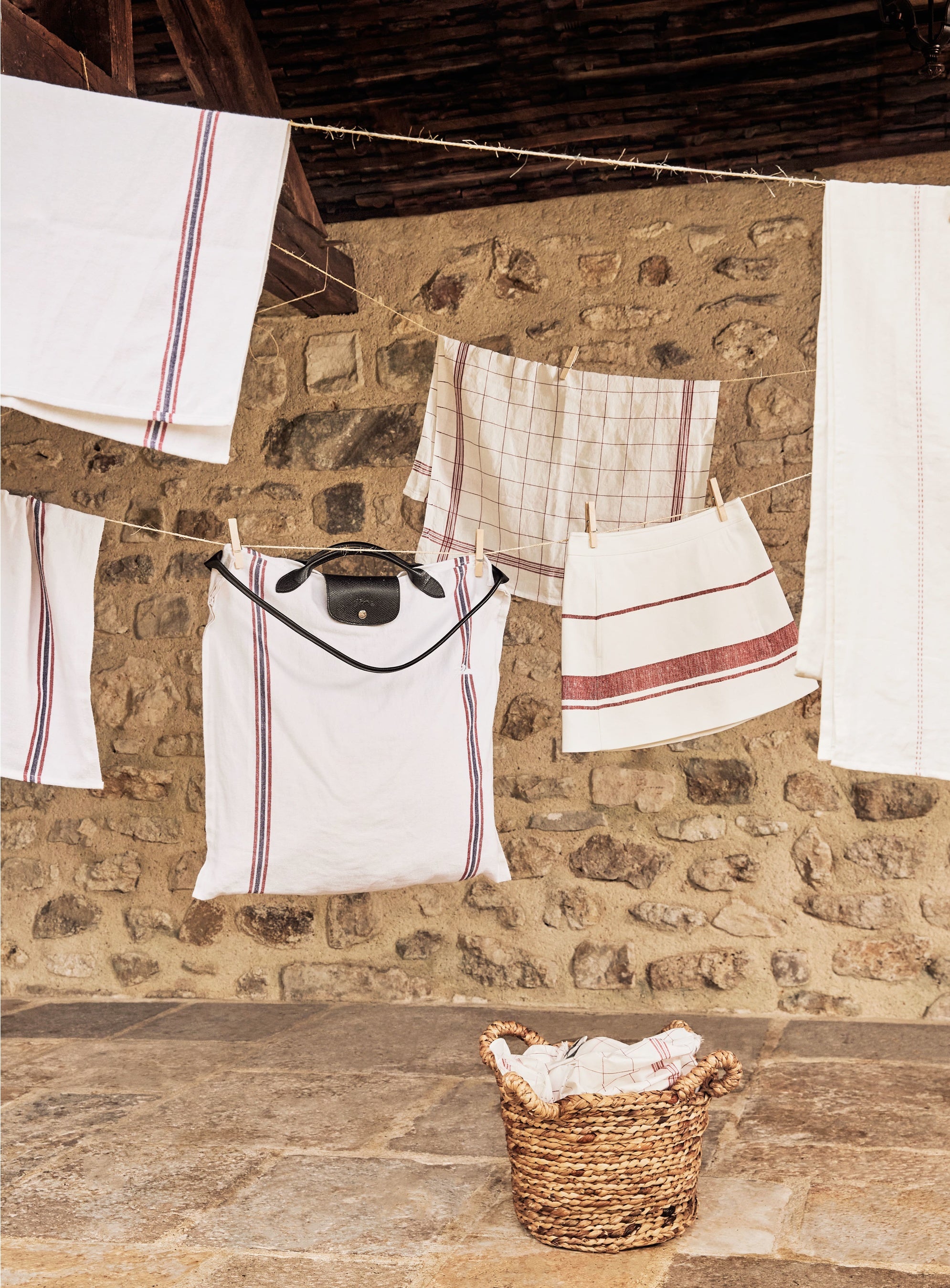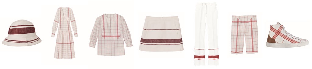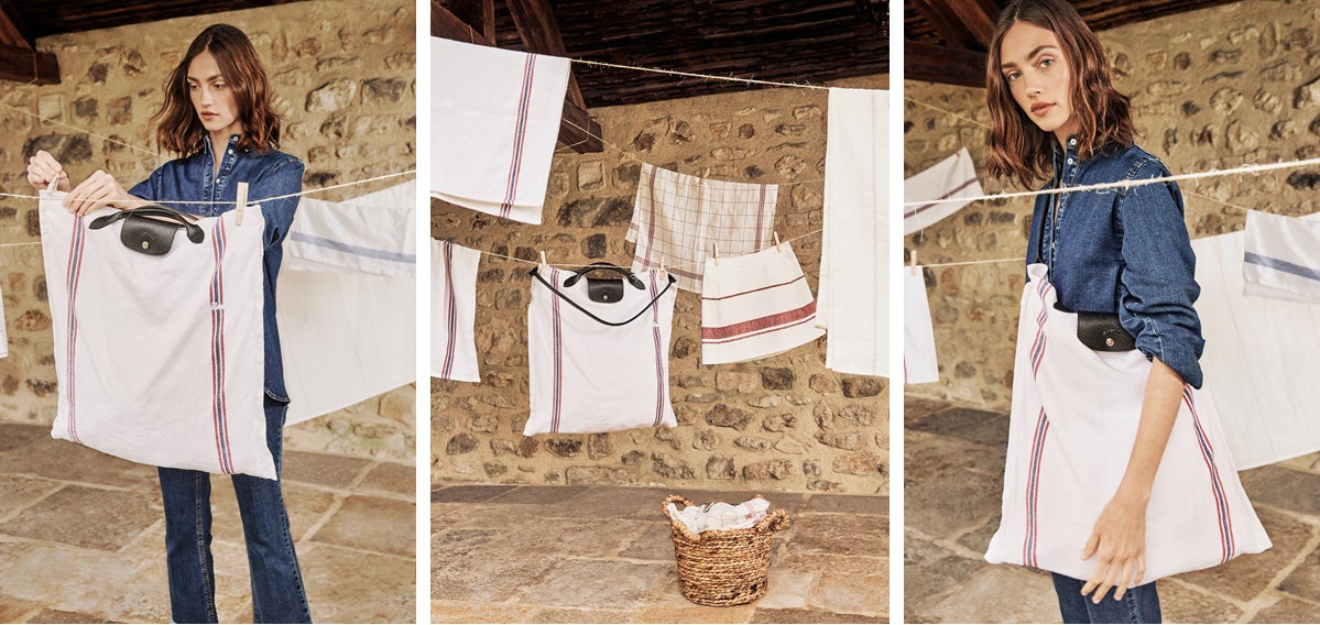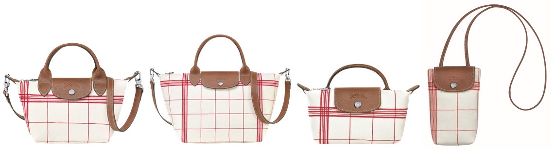 加えて、シャルベのフレンチリネンに着想を得た「ル プリアージュ®」新作として、お馴染みの赤いチェック柄をあしらったトップハンドルバッグ2種やハンドル付きポーチ、レザーレース付きスマートフォンケースも登場いたします。他にもロンシャン2022年春夏コレクションのプレタポルテでは、フレンチリネンのストライプとチェック柄が随所にあしらわれています。パリッとした白のコットンポプリンで仕立てたスカートやパンツの裾を彩る赤の太ストライプ、そしてコットン地で仕立てたロングドレスやブラウス、バーミューダショートパンツを駆け巡る細かなチェック柄が爽やかなリラックスムードを演出し、キャンバス地で仕立てたストライプのサンハットやチェック柄のハイカットスニーカーという今季注目のアクセサリーがその装いにさらなる華を添えます。