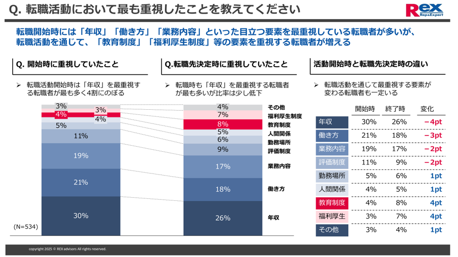 代わりに、教育制度(4%⇒8%)や福利厚生制度(3%⇒7%)や人間関係(4%⇒5%)といった、選考を進める中で具体化された要素を重視する転職者が増える