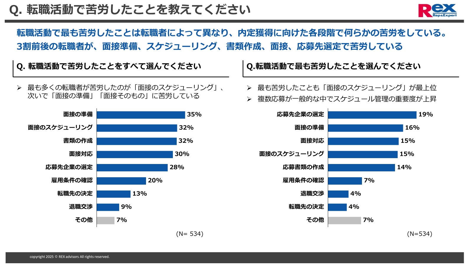転職者の35%が「面接の準備」に苦労している。他にも、スケジューリング(32%)、書類作成(32%)、面接対応(30%)と書類提出から面接で苦労