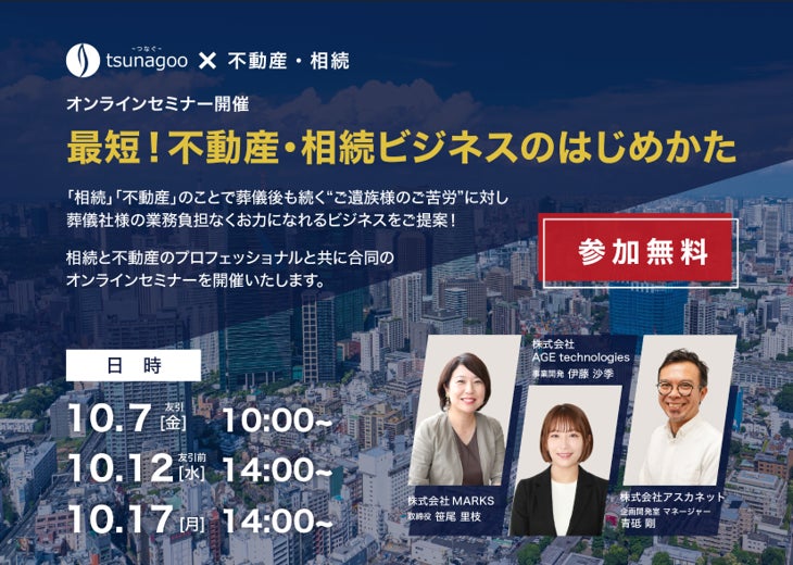 遺影写真作成サービス国内トップシェアを誇る株式会社アスカネット(本社:広島県広島市、代表取締役社長 松尾 雄司、以下 アスカネット)は、10月7日(金)、12日(水)、17日(月)の3日間、葬儀社様を主な対象とした、相続と不動産のプロフェッショナル3社合同によるオンラインセミナーを開催いたします。 「相続」「不動産」のことで葬儀後も続く“ご遺族様のお悩み”に対し、葬儀社様の業務負担なくお力になれるビジネスをご提案いたします。(※セミナー視聴には事前申込が必要です。)