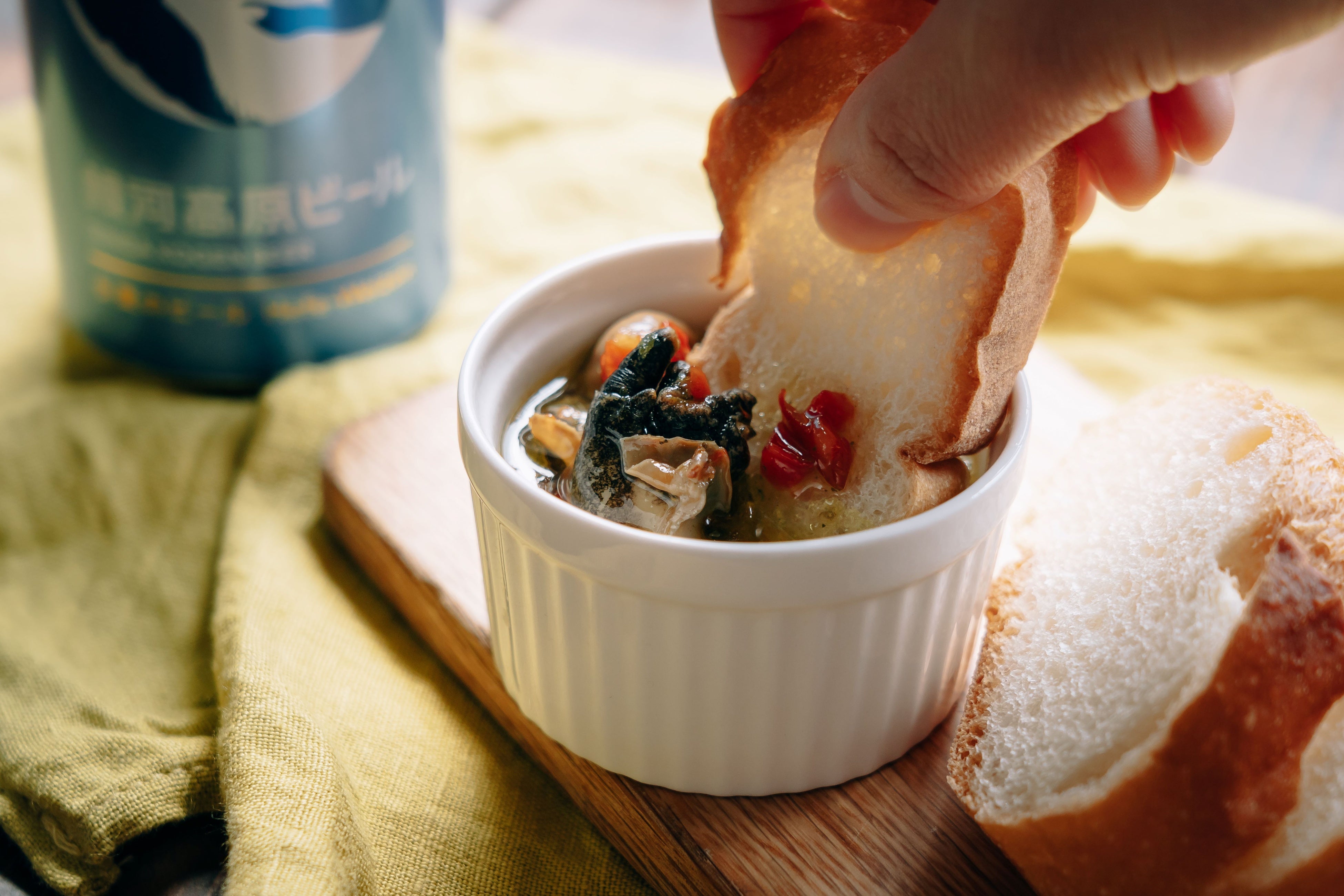 北海道産つぶ貝とマッシュルームを、香り高いバジルとチーズのコクが引き立つジェノベーゼのアヒージョにした「北海道産つぶ貝のアヒージョ(ジェノベーゼ風味)」とバゲットのセット。「銀河高原ビール 小麦のビール」はバジルなどの香草と相性抜群。香りの余韻を感じやすいペアリングとなり、同時につぶ貝とマッシュルームの風味もアップ。