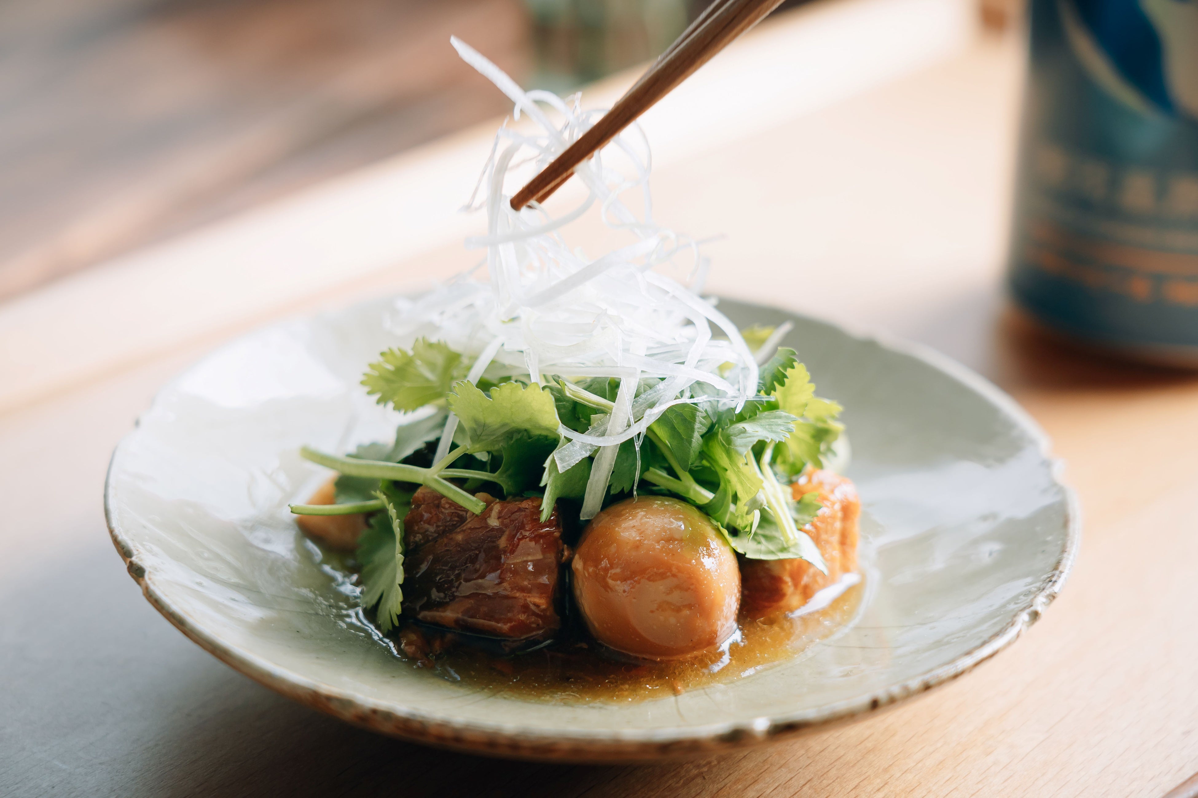 豚肉とうずら卵を、まろやかな酸味の黒酢を加えたコクのある甘辛醤油だれでじっくり煮込んだ「豚肉の黒酢角煮」に白髪ネギとパクチーをふんだんに盛り付けました。黒酢の酸味をおさえつつ「銀河高原ビール 小麦のビール」のまろやかさがコクを生み出します。さらにパクチーが後味をスッキリさせます。