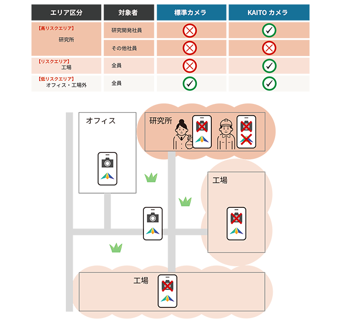 今回の連携により、ジオフェンス(位置情報)を起点としたアプリ利用統制が可能になります。本機能は、スマートデバイスのカメラ利用について適切な管理やルール整備が求められる機密性の高い製造現場や教育現場においての活用が期待されています。リスクの高いエリアや校内の特定エリアでは、標準カメラアプリを無効化し、情報漏えいリスクを排除しながらスマートフォンでの撮影が行える KAITO セキュアカメラを自動的に有効化することで、運用負荷の大幅な削減と、情報セキュリティの強化を実現します。