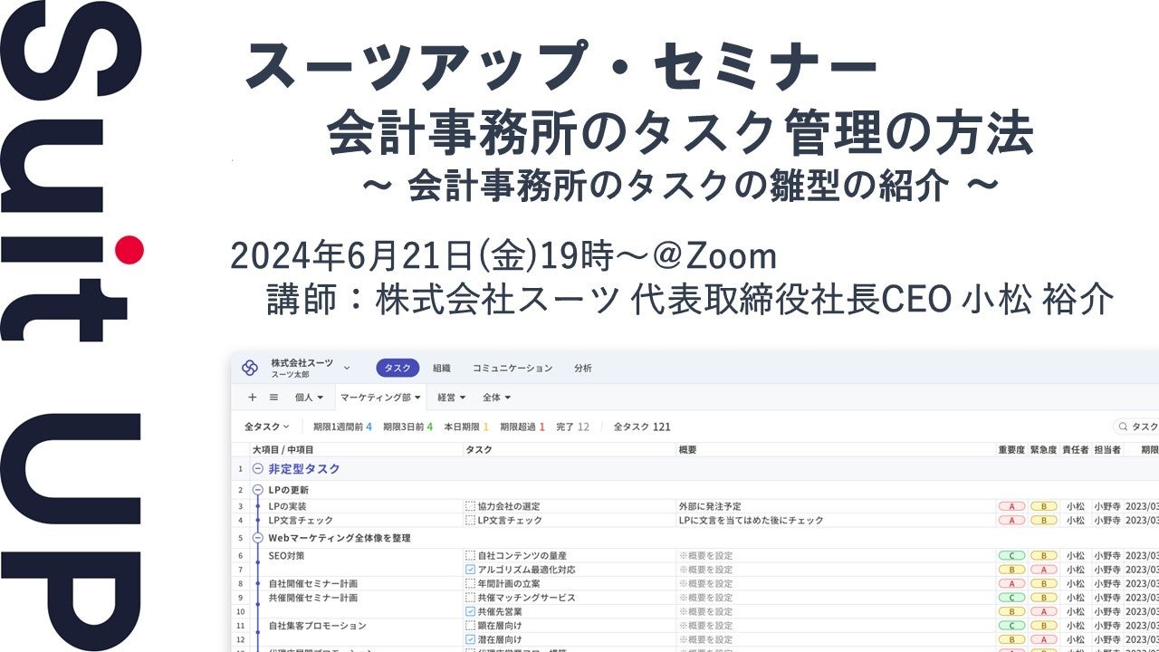 この度、株式会社スーツ(所在地:東京都千代田区、代表取締役社長CEO:小松 裕介)は、2024年6月21日(金)19時から、当社代表の小松が講師を務めるスーツアップ・セミナー「会計事務所のタスク管理の方法 ~ 会計事務所のタスク雛型の紹介 ~」を無料開催します。