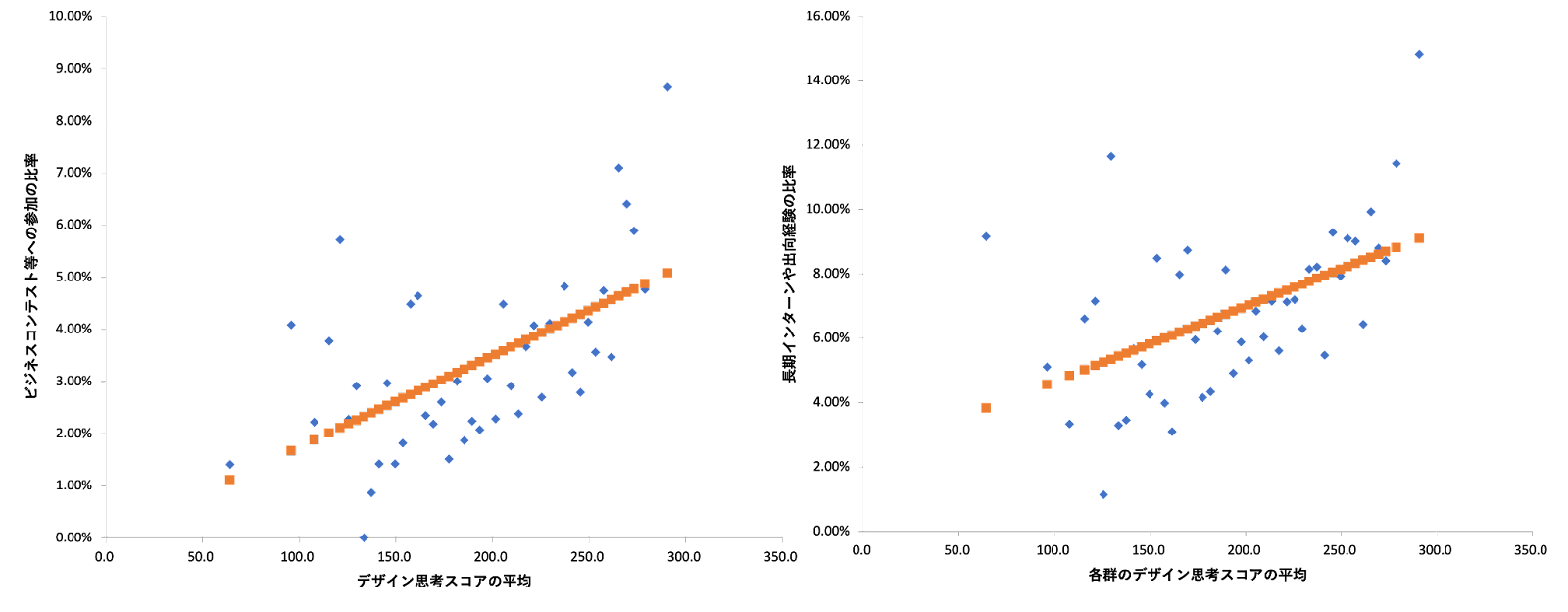 「課題発見力・解決策創造力」をスコアリングするデザイン思考テストのスコア有用性の実証のため、大学生受検者のデザイン思考スコアと、デザイン思考に関わる経験の有無を取得したデータ※との間で回帰分析を行いました。その結果、長期インターンなどの課題解決の実務経験、ビジネスコンテストへの参加といった2種類の経験と受検スコアとの間に正の相関が認められました。この分析によって、デザイン思考スコアの有用性が、デザイン思考的な考え方が求められる課題解決経験との相関からより強く裏付けられることが検証されました。