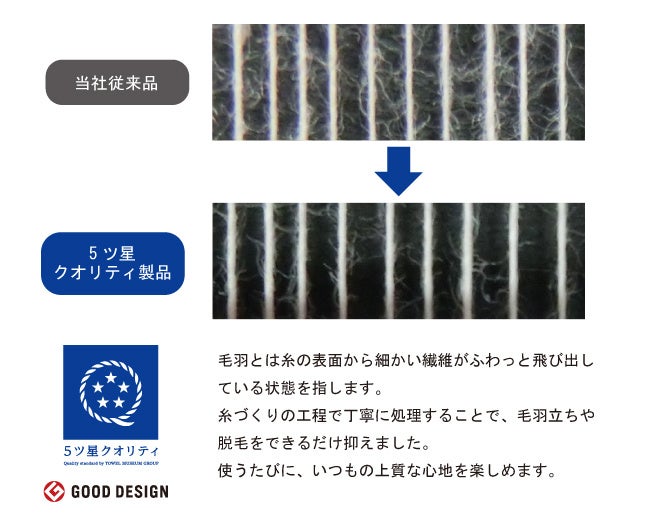 タオル美術館が開発した独自のコーマ糸「プレミアムフルフィーコットン」と、毛羽立ちを抑える「5ッ星クオリティ」製法により、洗うたびにふっくらとした風合いと吸水性が持続。柔軟剤に頼らず、自然なやわらかさを叶えます。