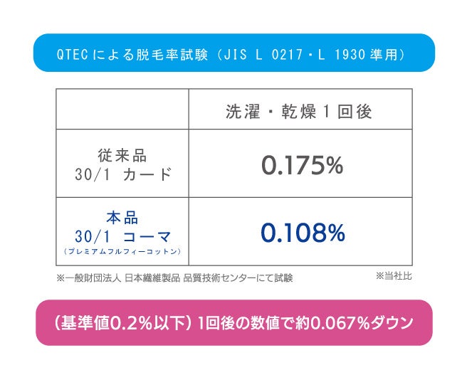 QTECによるJIS準拠の脱毛率試験(洗濯+乾燥)で、毛羽重量が基準値0.2%以下(0.108%)という優れた結果を実証。タンブラー乾燥機使用でも毛羽が出にくく、パイルが自然に立ち上がることで、ふっくらやわらかな風合いが続きます。乾燥機との相性に本気で向き合ったタオルです。