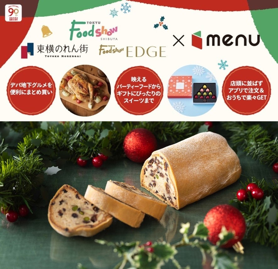 今年のクリスマスは、渋谷駅周辺に展開する食の3拠点のフードを<menu>のデリバリーでもお楽しみいただけます。12月5日(木)から展開する「クリスマスフード」特集ページでは、シュトーレンをはじめとしたクリスマスの定番アイテムから、ギフトにもおすすめのこの時期ならではの限定品、ご自宅でのパーティーを盛り上げる華やかなデリ・オードブルまで多数取り揃えます。期間限定の割引クーポンも配信しますので、“便利に・お得に”クリスマスフードをお楽しみいただけます。