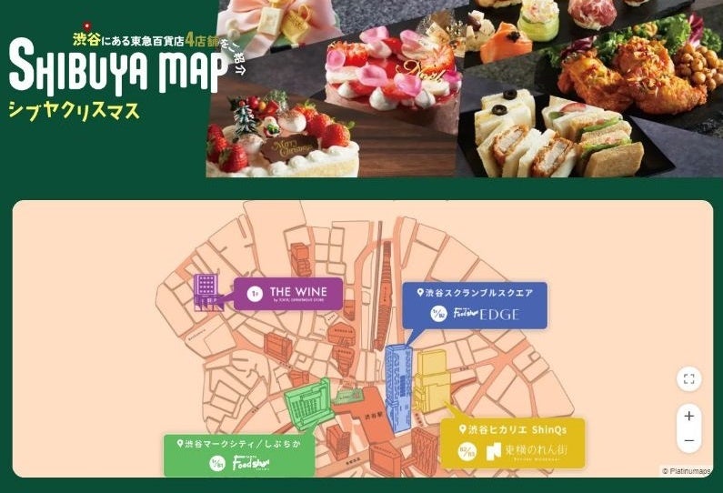 渋谷に展開する食の4拠点のクリスマスケーキやオードブル、ギフトのWEB予約情報に加え、クリスマス直前需要に合わせ、各店店頭にて当日、予約なしで買えるクリスマスフード情報を紹介しています。デジタルマップとも連携し、利便性を高めながら渋谷のクリスマスを盛り上げます。
