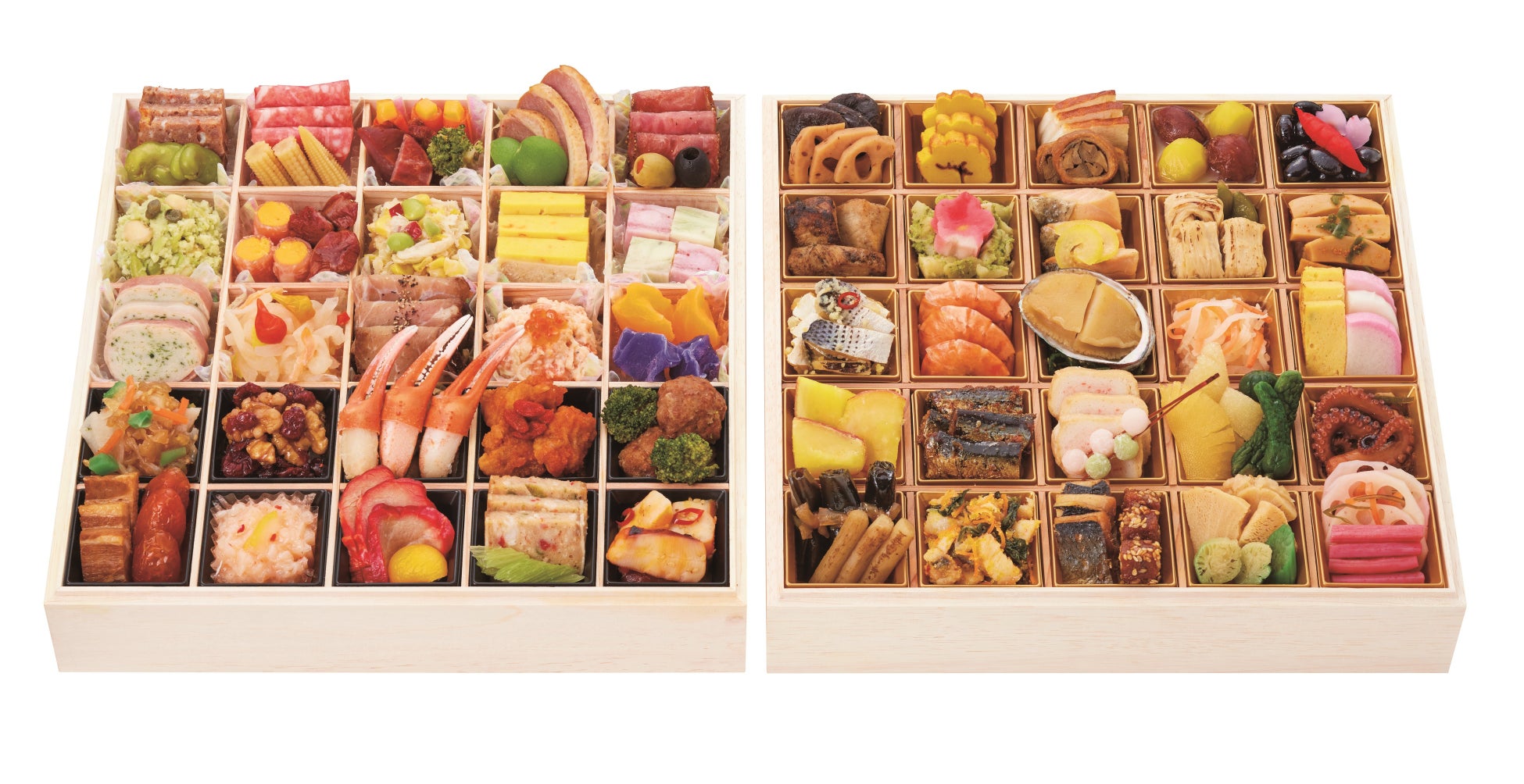 日本伝統のおせち料理に加え、中華料理と西洋料理のオードブルをセットにしたおせち。東急百貨店創業90周年にちなみ、90品目のバラエティーに富んだ美味を用意しました。