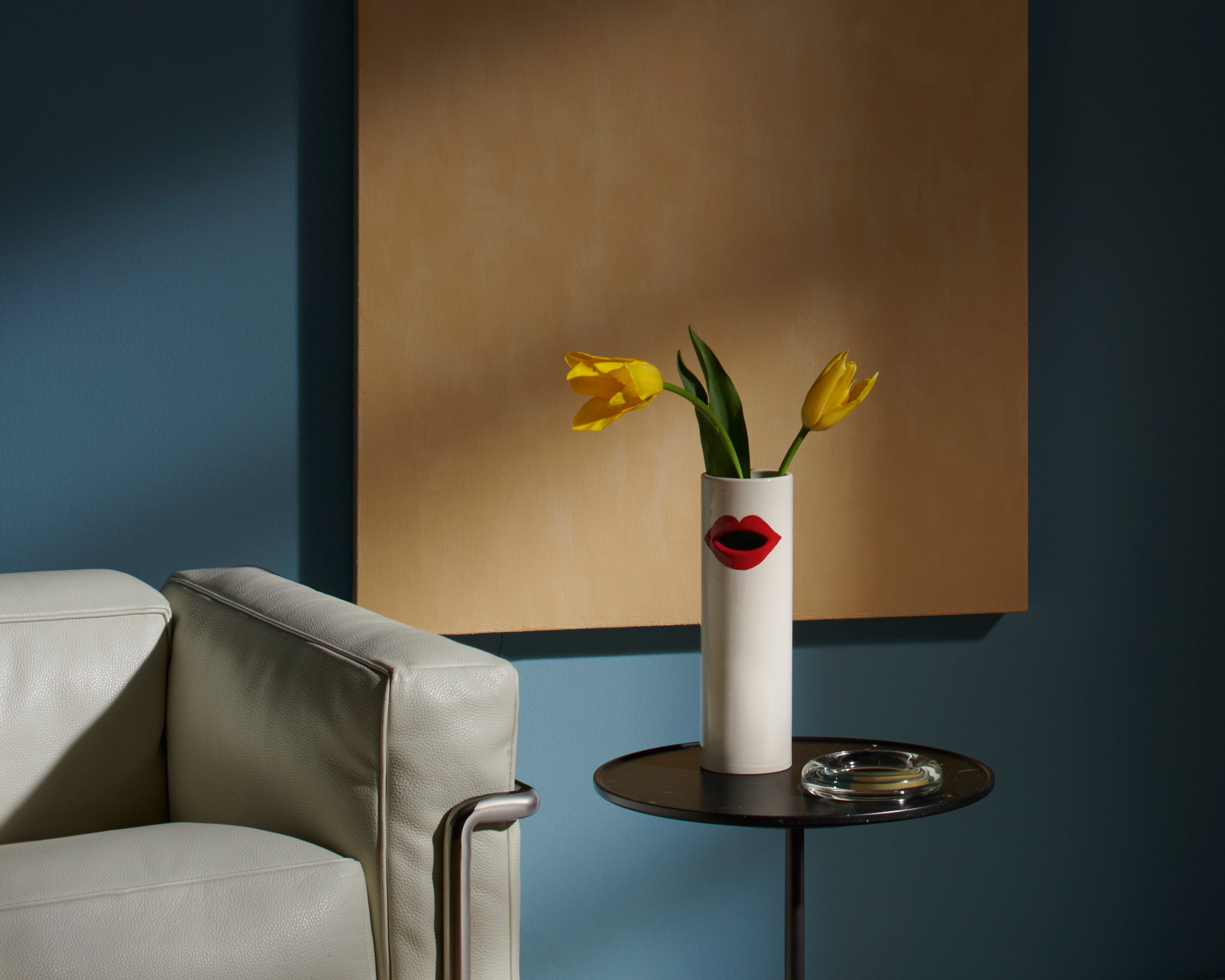 ポップアートを連想させるBoccaベースは、オリジナルよりサイズを大きくした、ミニマルな円筒形のフォルム。真っ赤な唇のデザインと、エナメル加工のセラミックの真っ白な部分が官能的なコントラストを成しています。