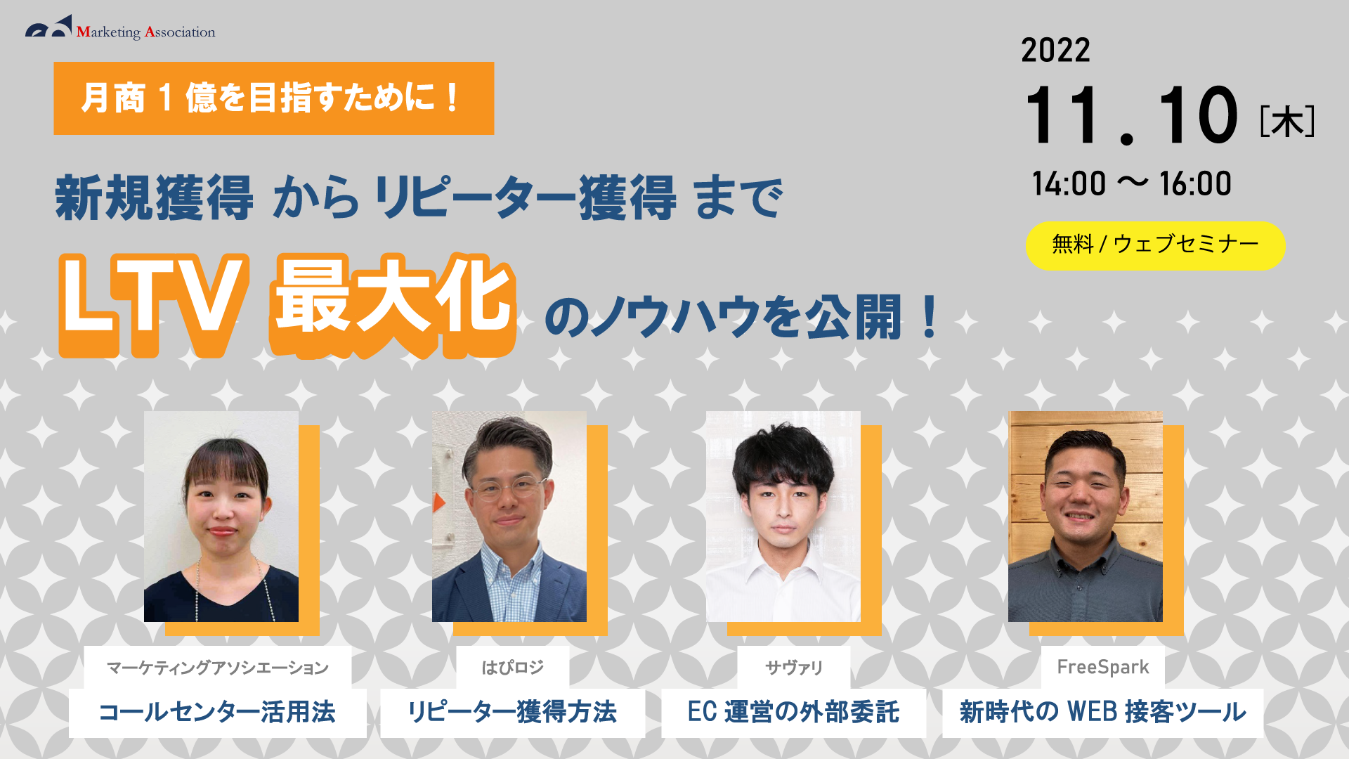 流通インフラプラットフォームサービスを展開する株式会社はぴロジ(所在地:東京都港区虎ノ門、代表取締役社長:木村 和弘、URL:https://www.hapilogi.co.jp、以下「はぴロジ」)は、サヴァリ株式会社(本社:東京都中央区、代表取締役:福田泰志)、株式会社FreeSpark(本社:東京都港区南麻布、代表取締役:メディロス・スティーブン・ヨシヒロ)、マーケティングアソシエーション株式会社(本社:東京都台東区、代表取締役:中園広和)の3社と2022年11月10日(木)14:00〜16:00に『新規獲得からリピーター獲得まで・LTV最大化のノウハウを公開!』と題した共催セミナーを開催いたします。