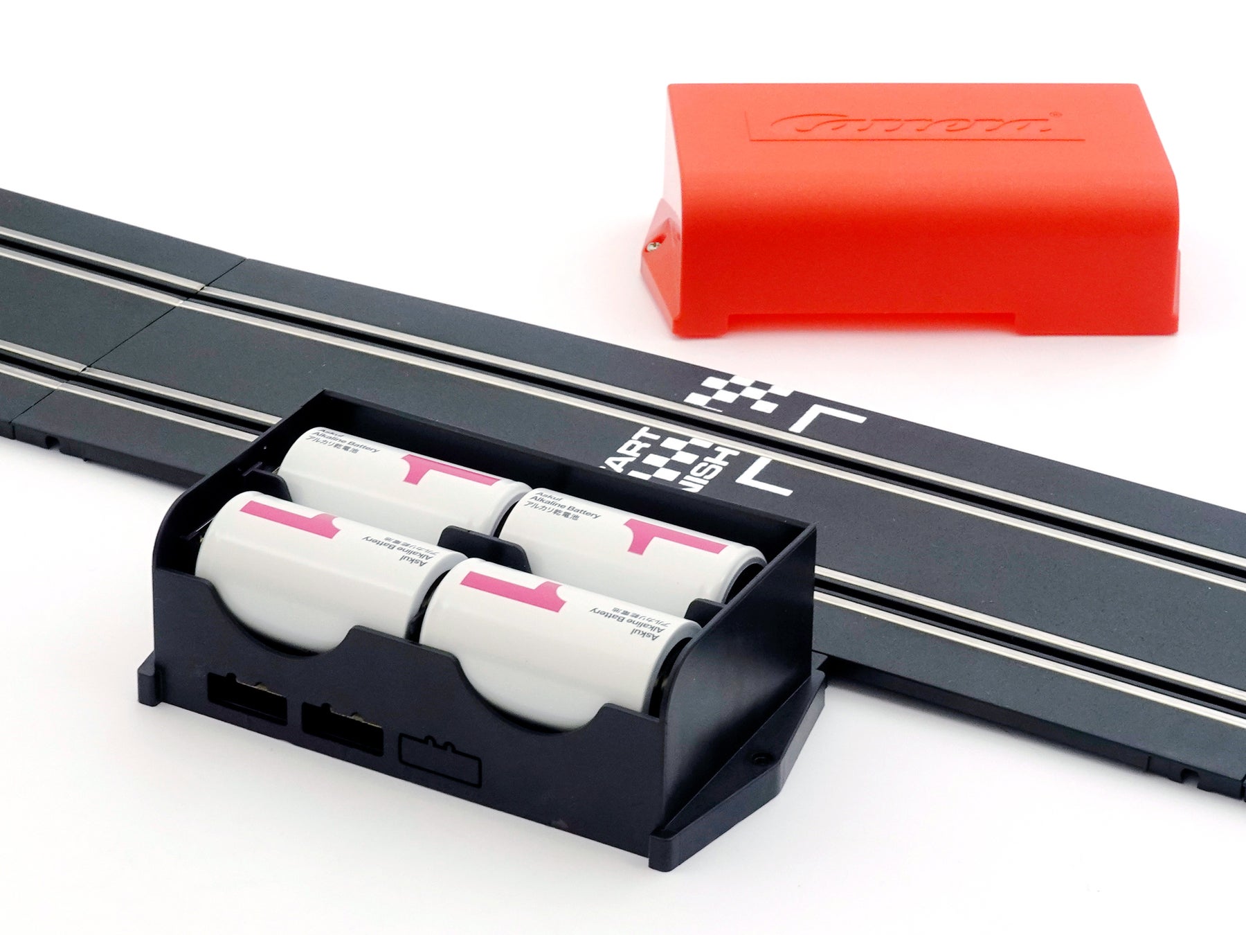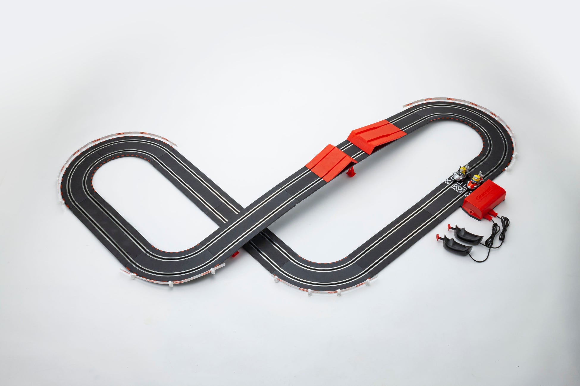 コントローラーの上にあるトリガーを親指で押し込む強弱によりスロットカーの速度を調整可能。同時に2台での走行が可能で、家族や友人と一緒にレースを楽しめます。