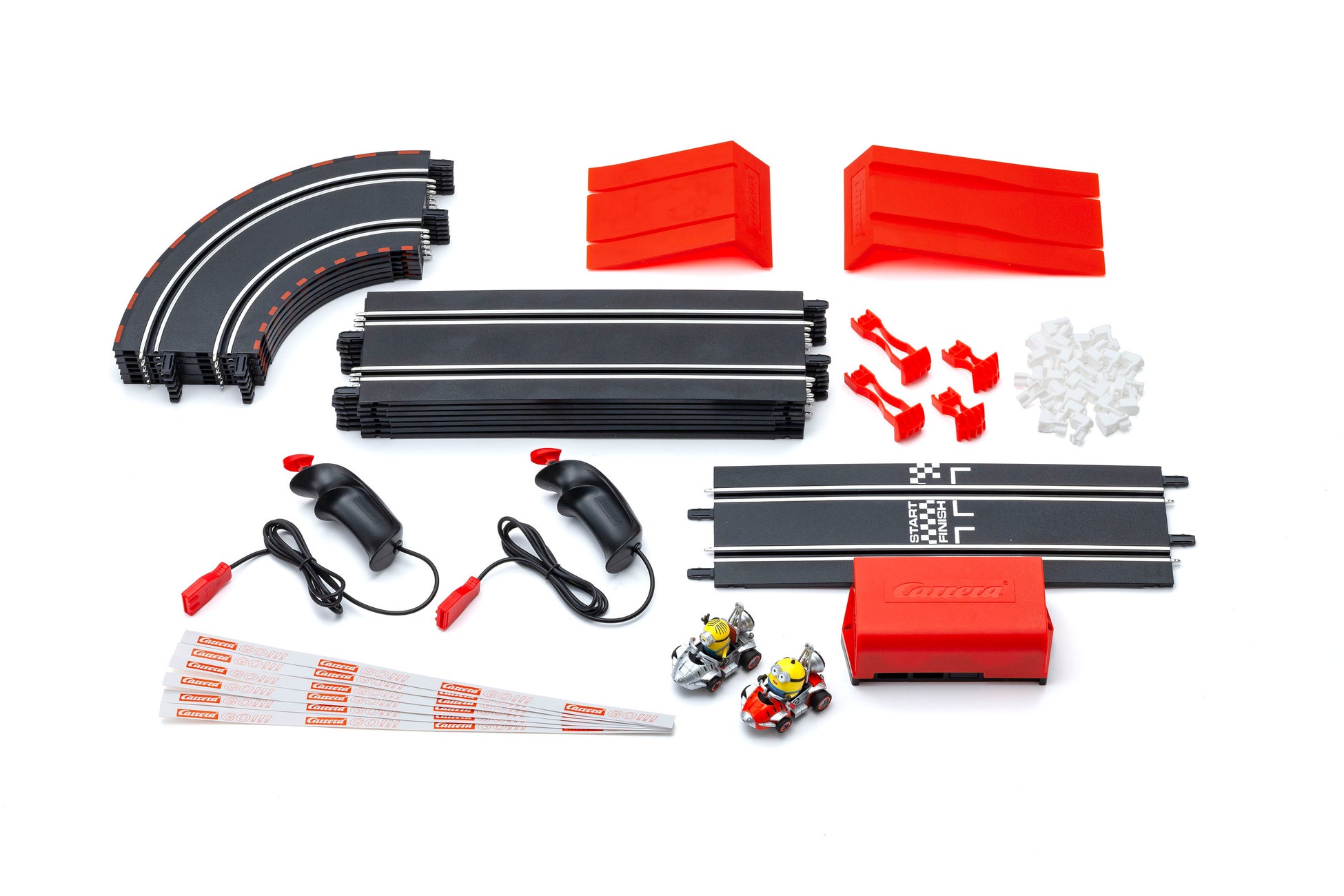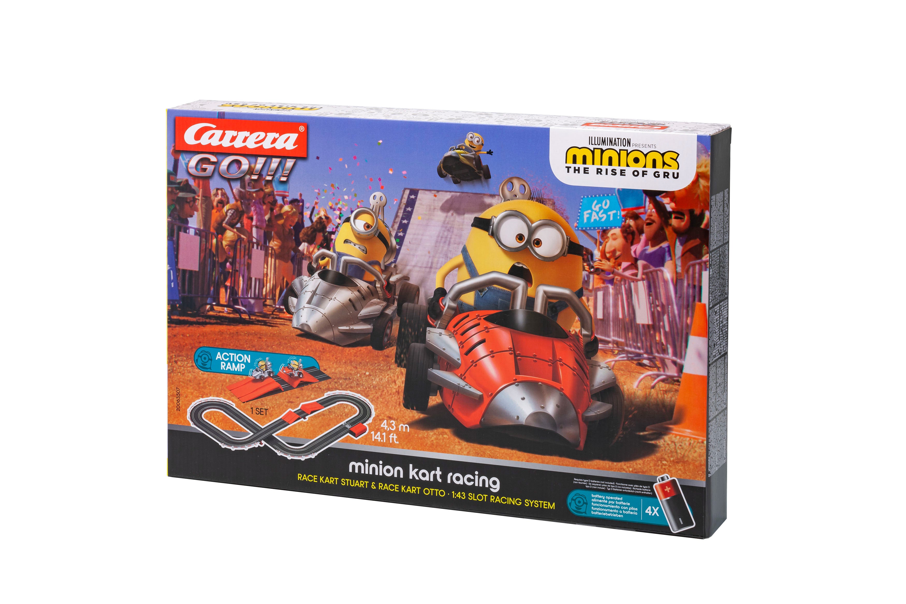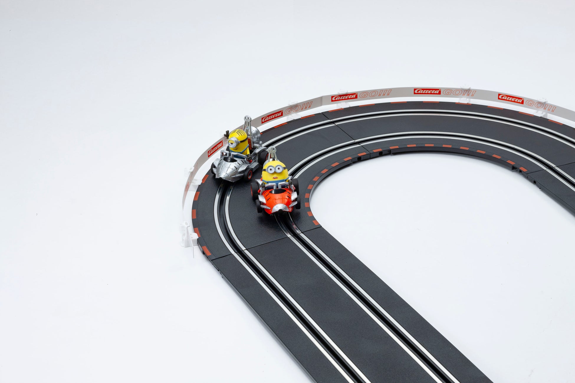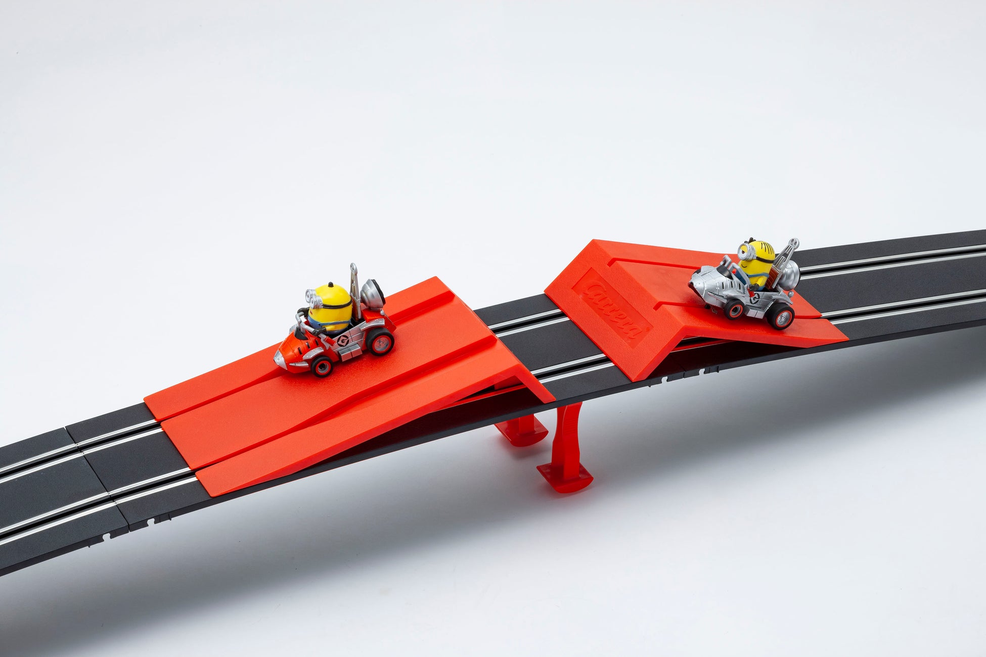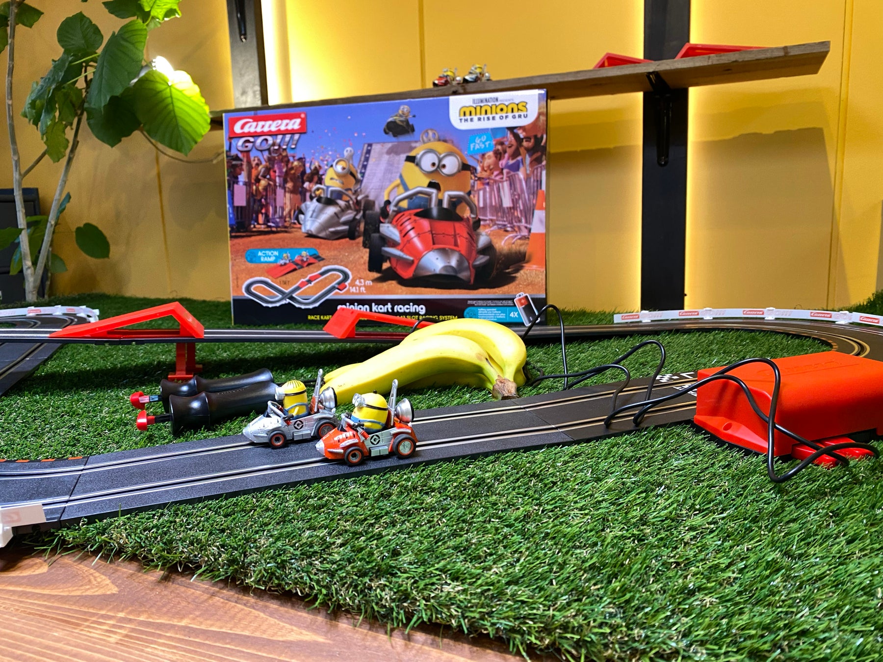 ミニオン カートレーシンングは全長約4.3メートルのコース。付属の橋脚をコースの下に装着すれば、立体交差のある8の字コースで遊ぶことができます。