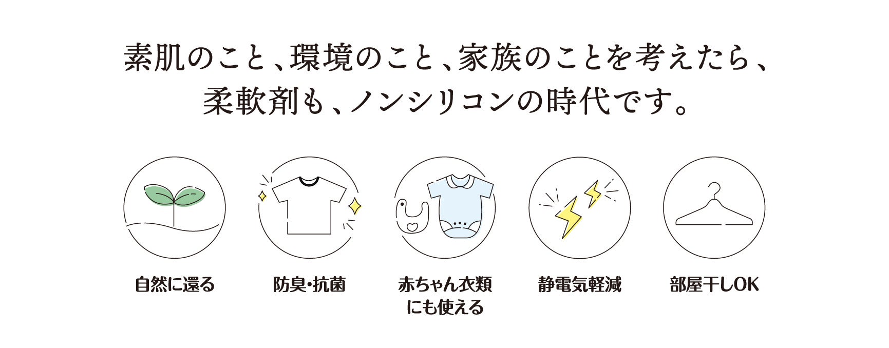 ノンシリコンの天然植物由来で肌への負担も軽減。肌の弱い方やお子様にも安心してお使いいただけます。衣類からもスキンケアを。