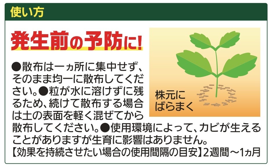 特長: 土にまくだけで病気を予防する抵抗性誘導の殺菌粒剤。