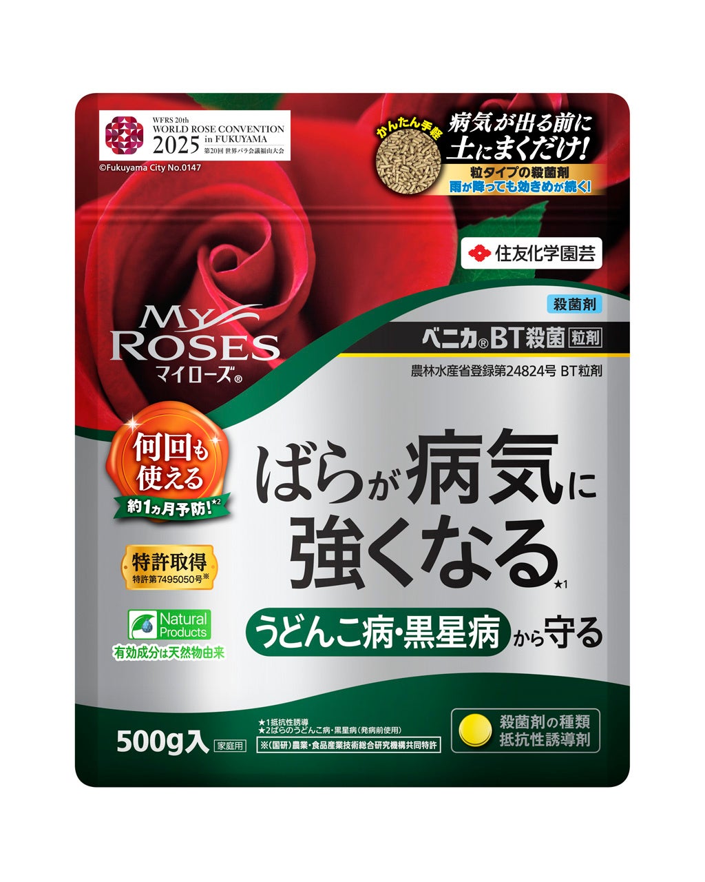 バラ栽培専用ブランド「マイローズ®」の新ラインナップ登場!使用回数制限なしの殺菌粒剤「マイローズ®ベニカ®BT殺菌粒剤」リニューアル&新容量「マイローズ®ばらの培養土」