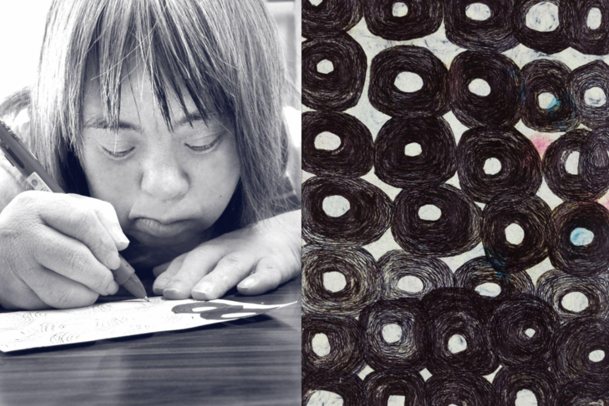 クーピーペンシルやクレヨンを塗り重ねることで作り上げられた作品は、一見すると、素早い鉛筆の動きを要する激しい制作態度を連想させる。しかし実は、彼女の制作は非常にゆっくりと穏やかである。彼女の描き出すひとつひとつの色は、お互いに交じり合うことなく、それぞれにその美しさを主張しながら画面の上に現れ、激しさと静けさが不思議に同居しており、心を惹きつけられずにはいられない。