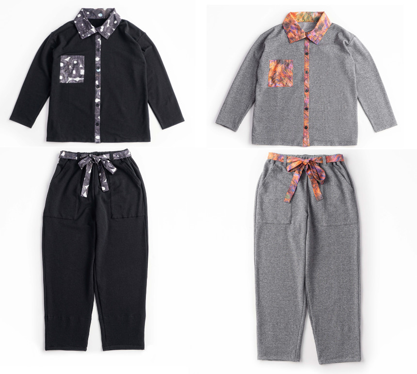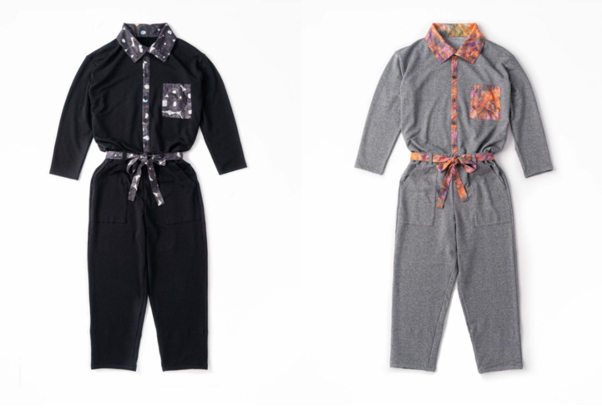 トップスの襟、胸ポケット、前たて部分とボトムスのベルト(取り外し可能)、裾の折り返し部分にアートテキスタイルが使用され、日々の瞬間を彩ります。