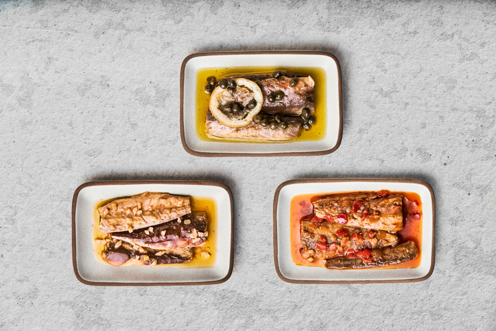オリーブオイル漬。レモンケイパー、スパニッシュパプリカ、ローストガーリックの3種。