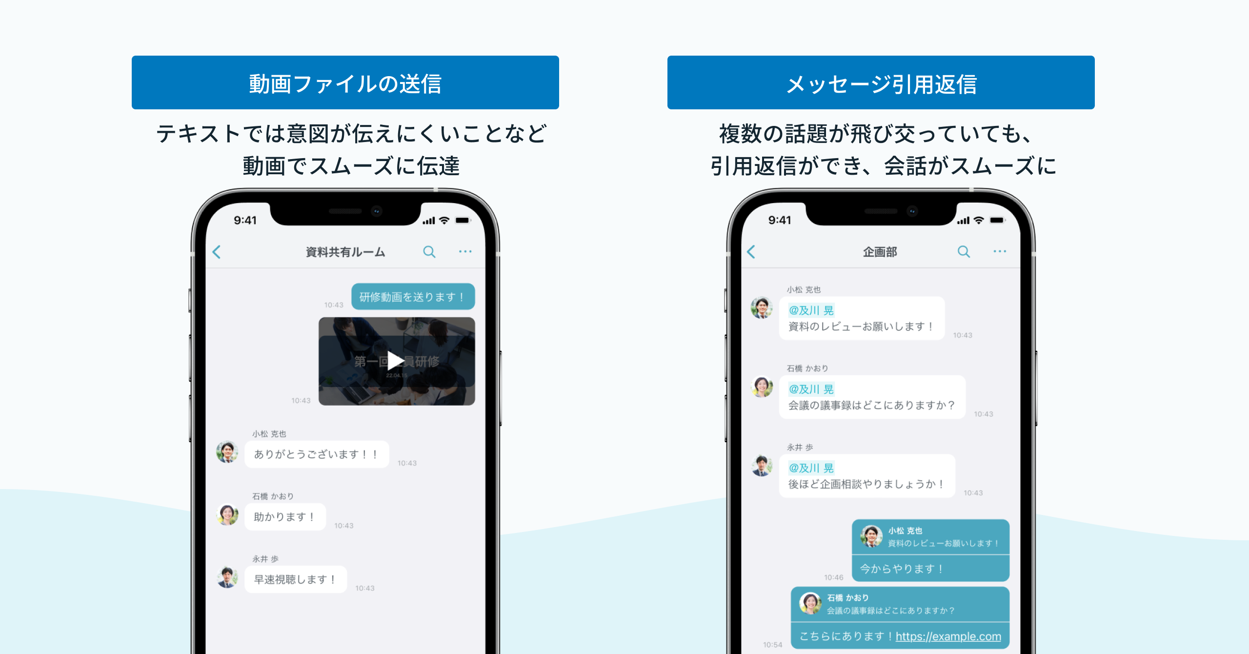 やり取りが多く複数の話題が飛び交う場合や、チャットグループのメンバーが多くやり取りが複雑な場合に、特定のメッセージに対して引用返信ができ、チャット上のメッセージの混線を防ぎ、円滑なコミュニケーションが可能です。
