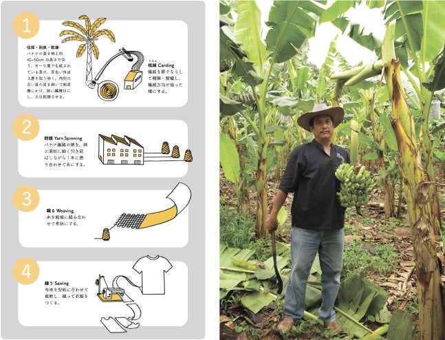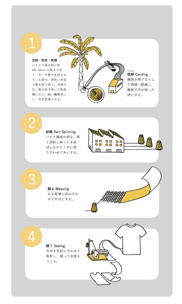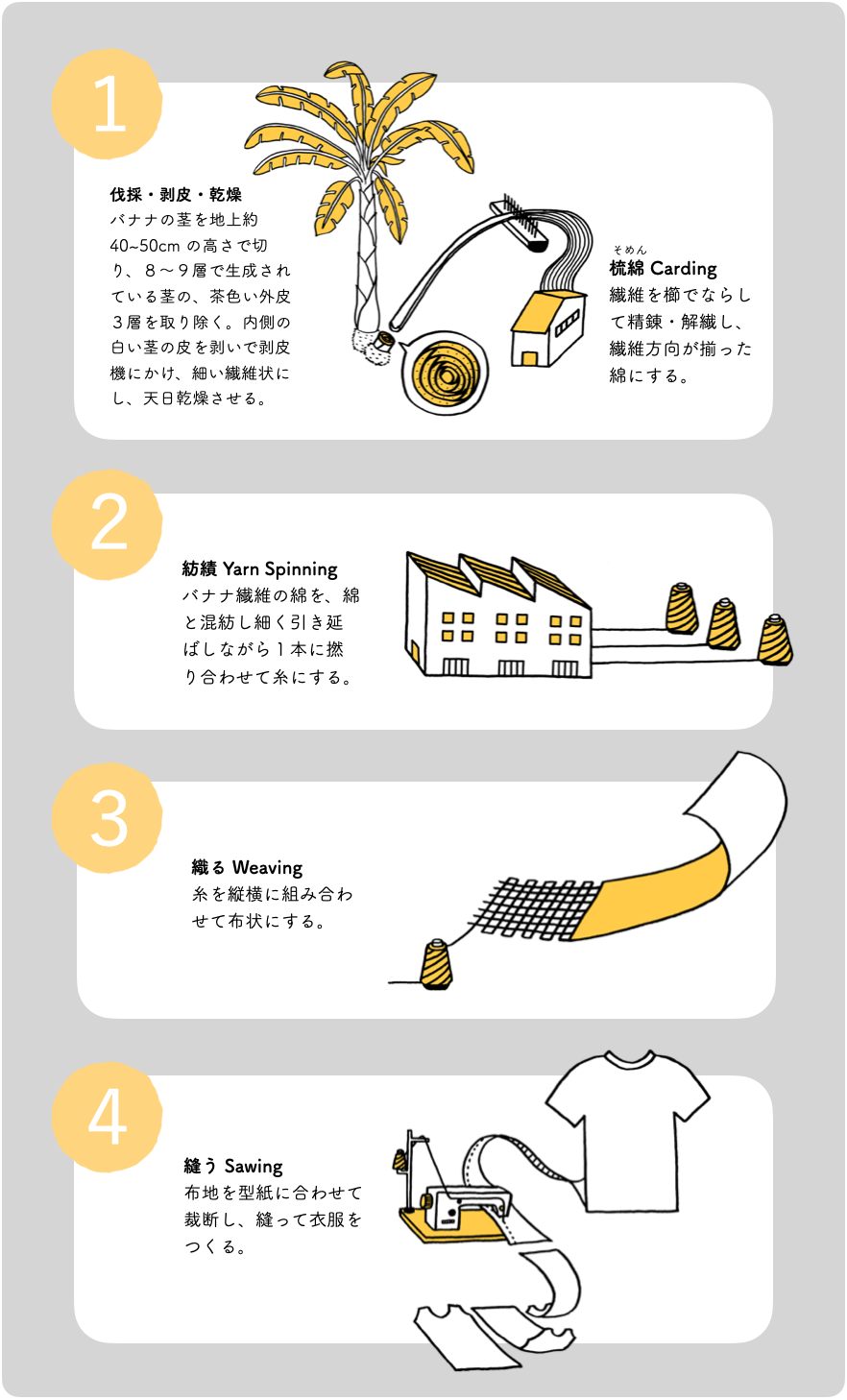 BANANA CLOTH委員会は、食用バナナの実の、収穫後に廃棄される茎の部分から採取した繊維を利用した生地・「バナナクロス」の普及を目標として、M・Nパートナーズ、ソトー、吉田染工、貴志川工業、ループ、MNインターファッションらの繊維関連企業が共同で発足したプロジェクトチームです。バナナクロスは、茎の廃棄や放置により発生する悪臭や土壌汚染を軽減し、環境保全やバナナ農家の収入増加に寄与する新たな天然繊維として注目されています。