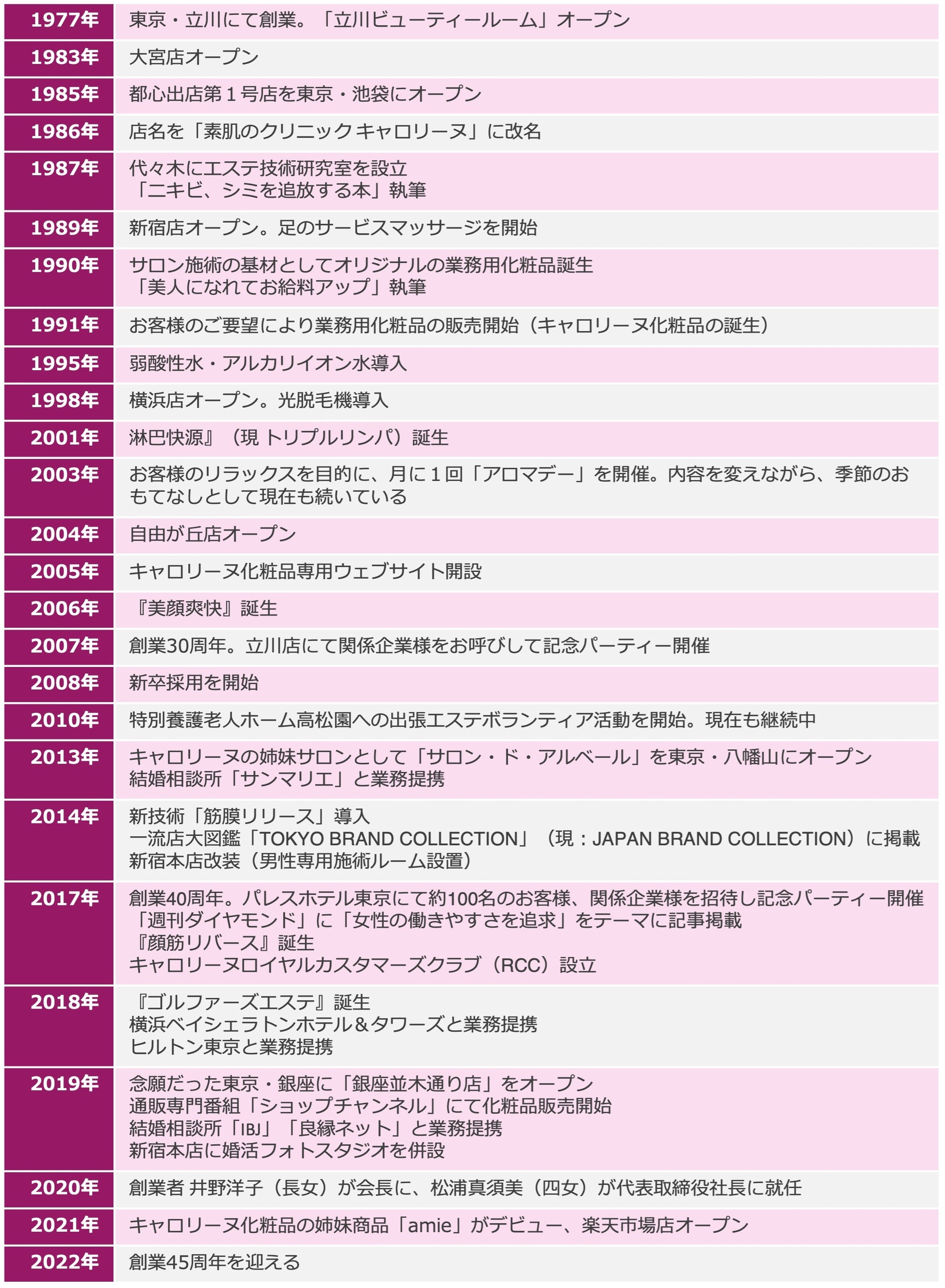 1977年の創業以来姉妹で経営し、お客様の肌と真摯に向き合いひたむきに進んでまいりました。40周年を迎えた2017年以降、サロンにおいては、旗艦店銀座並木通り店開店をはじめ、複数店舗の移転やリニュアルにより、より良い店舗環境を提供。そして、オリジナル化粧品事業の拡大を図り、自社オンラインショップや通信販売番組を通して全国のお客様にキャロリーヌの化粧品をお届けしています。また、企業としての社会的責任を考え、さまざまな社内制度の整備、充実化を行ってきました。情報セキュリティーの強化や防災対策、人事評価や福利厚生などを明文化、制度化、可視化し11種類のハンドブックにまとめて全社員で共有しています。