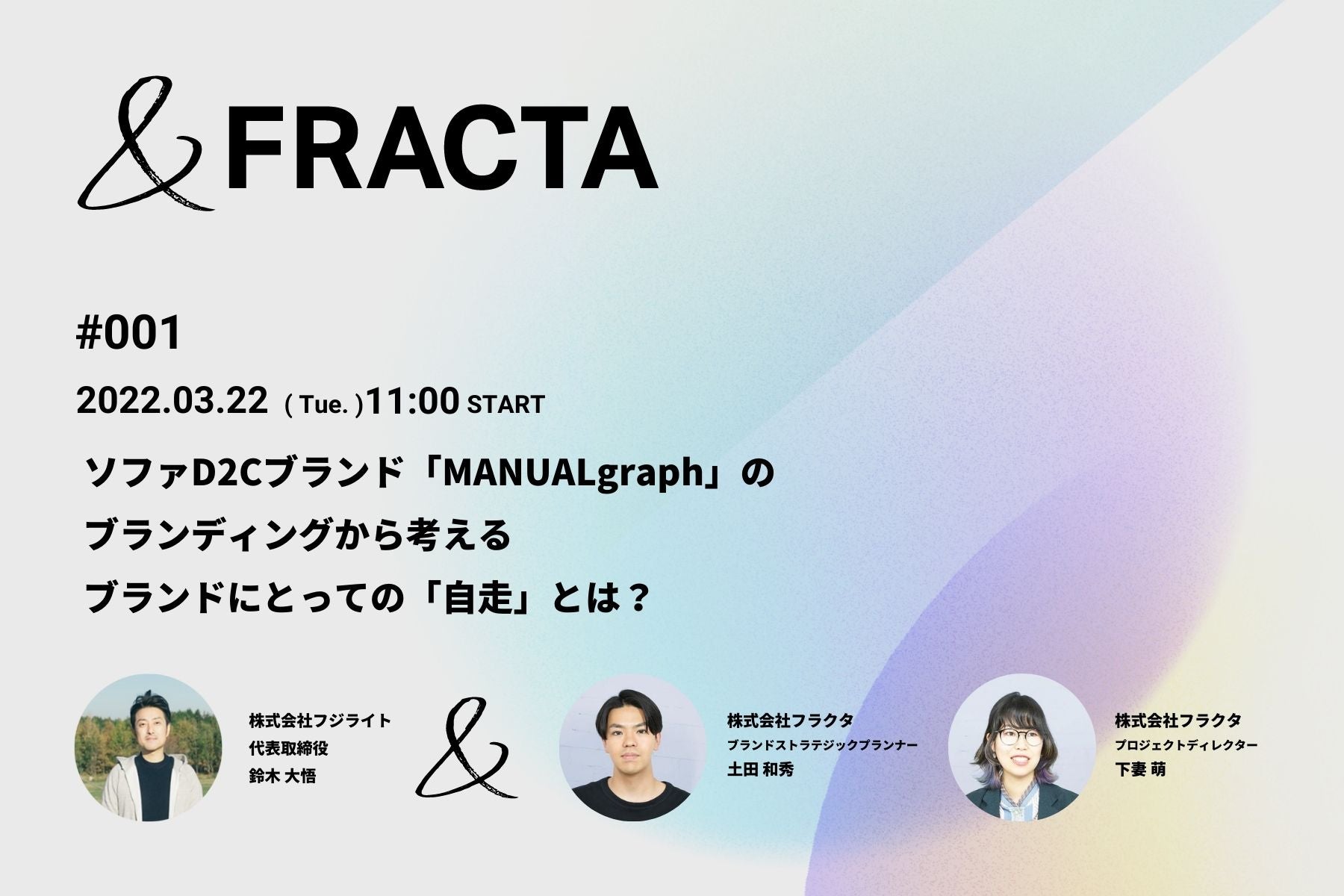 株式会社フラクタ(東京都渋谷区、代表取締役社長:河野貴伸/以下、FRACTA)は、ブランドや企業との取り組みを紹介する対談イベント「&FRACTA」(アンド・フラクタ)を開催します。第1回目は、2021年5月から12月にかけてFRACTAがブランディングに携わった、静岡県裾野市のソファ専門ブランド「MANUALgraph」 を手がける株式会社フジライトの代表取締役・鈴木大悟氏をゲストに迎え、オンラインでの対談イベントを実施します。
