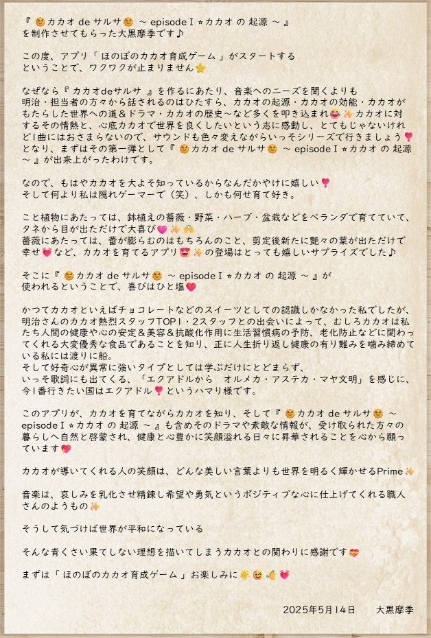 「楽曲を作るにあたって、カカオの起源・効能・歴史などを学び、その志に感動し、1曲にはおさまらないのでシリーズ化することになった。」「明治さんのカカオ熱烈スタッフとの出会いによって、学ぶだけにとどまらず、いっそ歌詞にも出てくる「エクアドル」に今1番行きたいと思っている。」「カカオのドラマや素敵な情報が、この楽曲を受け取られた方々の暮らしへ自然と啓蒙され、健康と心豊かに笑顔溢れる日々に昇華されることを心から願っています。」などとコメントをいただいております。