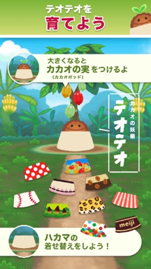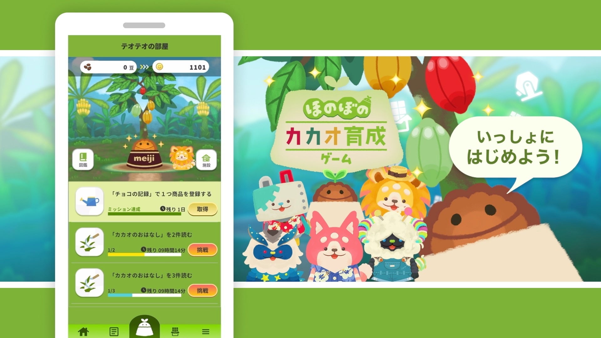 株式会社明治(本社:東京都中央区、代表取締役社長:松田 克也)は、スマートフォン用アプリ「ほのぼのカカオ育成ゲーム〜テオテオと過ごす癒しのカカオ農園〜」をリリースいたしました。