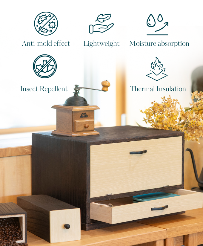 梅雨の湿気と冬の乾燥——湿度の振れ幅が大きい日本で培われた「桐に仕舞う」という文化を、世界のキッチンへ。