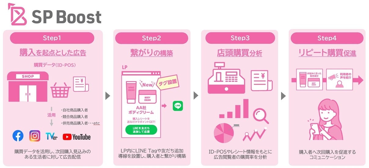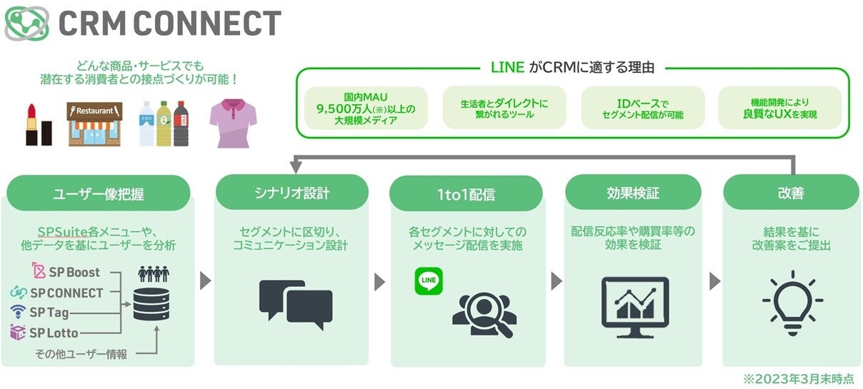 「SP Suite」の各サービスにて取得したデータを活用し、LINEを活用した、消費者の「また買いたい」を実現するためのコミュニケーション設計をサポートするサービスです。