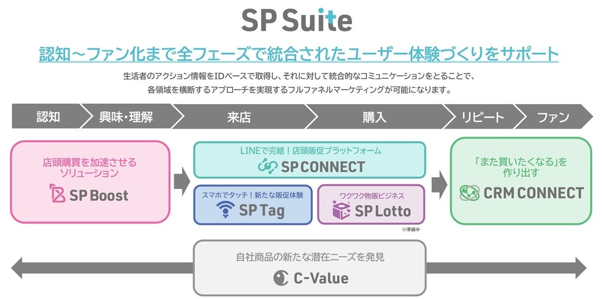 2017年にサービス提供を開始した「SP CONNECT」「C-Value」、2020年の「CRM CONNECT」に加え、新たに「SP Boost」「SP Tag」「SP Lotto(※準備中)」のサービスを追加し、全6つのサービスを統合して、消費者の体験価値を創り出す「SP Suite」として提供することで、消費者行動におけるセールスプロモーションサービスを網羅します。今後、さらに拡充も予定しています。