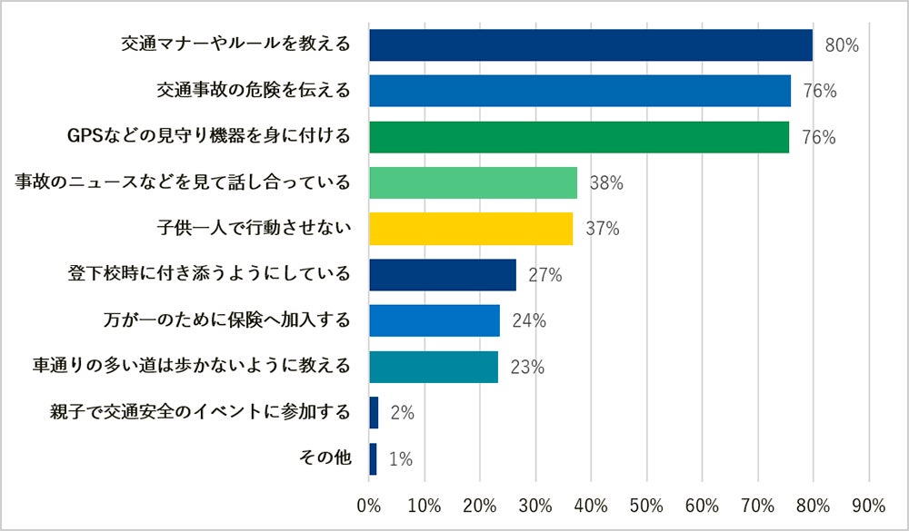 最も多く挙げられた取り組みは、「交通マナーやルールを教える(80%)」「交通事故の危険を伝える(76%)」などの言葉による指導・教育でした。これは多くの家庭で実施しやすい方法ですが、子どもの年齢や性格によっては理解の定着や実行が難しいこともあります。