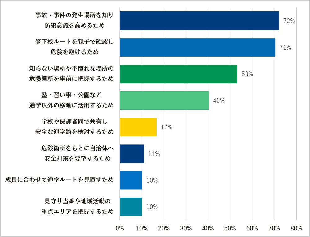 利用目的のトップは「事故・事件発生場所を知り防犯意識を高める(72%)」、次いで「登下校ルートを親子で確認し危険を避ける(71%)」でした。