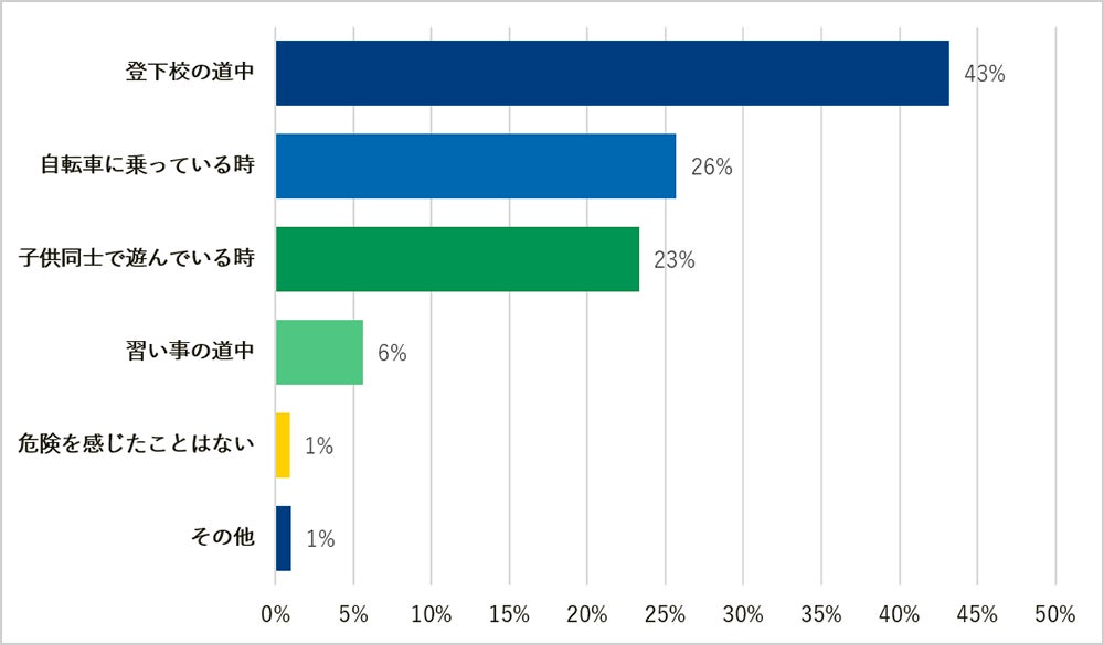 保護者が危険を感じるシーンとして最も多かったのが、「登下校の道中(43%)」。次いで「自転車に乗っている時(26%」「子供同士で遊んでいる時(23%)」の順に続きました。特別なイベントや時間帯ではなく、日々必ず通る通学路は安心感が生まれやすく、慣れによる注意力低下が事故リスクを高めています。また、「自転車利用時」については、年齢が上がって行動の自由度が増すにつれ、新たなリスクが出てくることも示唆されています。