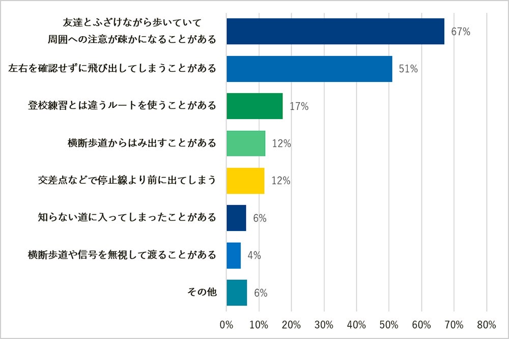 保護者が子どもに対して「交通ルールを守れていない」と感じる具体的な行動として最も多かったのは、「友達とふざけながら歩いていて周囲への注意が疎かになる(67%)」でした。
