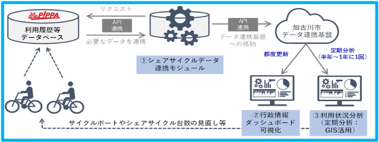 加古川市(市長:岡田 康裕)、ALSOK(代表取締役社長:栢木 伊久二)、株式会社日建設計総合研究所(代表取締役所長:朝倉 博樹 以下、NSRI)、ジョージ・アンド・ショーン株式会社(代表取締役社長:井上 憲 以下、G&S)、株式会社フューチャーリンクネットワーク(代表取締役:石井 丈晴 以下、FLN)、NECソリューションイノベータ株式会社(代表取締役 執行役員社長:石井 力 以下、NECソリューションイノベータ)、株式会社オーシャンブルースマート(代表取締役社長:小竹 海渡 以下、PiPPA)の7者は、加古川駅などの拠点となる空間の魅力の向上、賑わいを創出する取り組みや、高齢者の外出機会の創出及び見守りサービスの充実をはじめ、カーボンニュートラルにも貢献したまちづくりを行うため、「加古川市情報通信技術利活用コミュニティサイクル」を導入します。