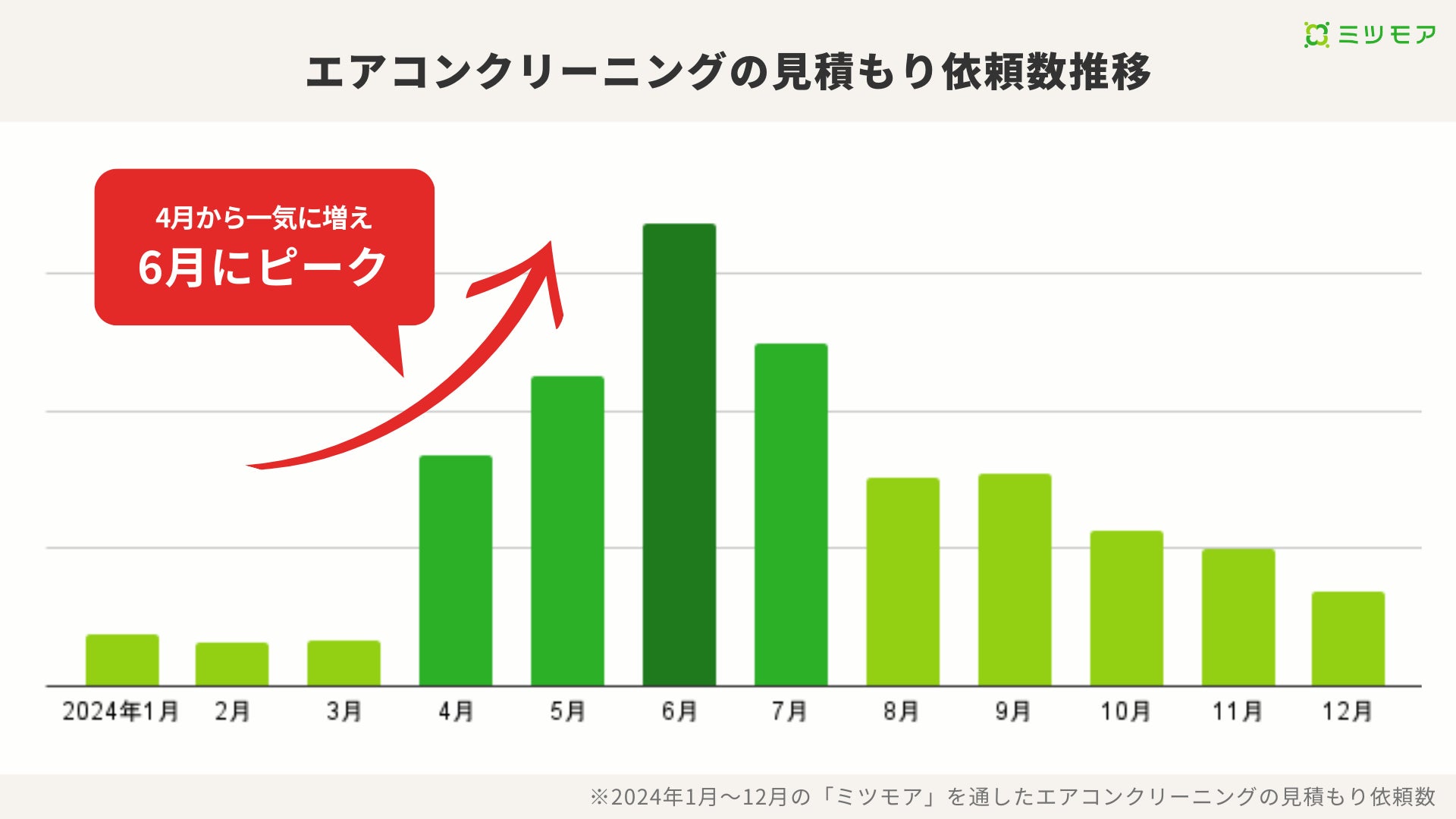 「ミツモア」におけるエアコンクリーニングの月別見積もり依頼データによると、3月から4月にかけて依頼数が約5倍に急増しています。その後も4月から6月にかけて約2倍に増加し、ピークを迎える傾向が見られました。7月はピークの6月に比べるとやや減少するものの、依然として高い水準を保っています。