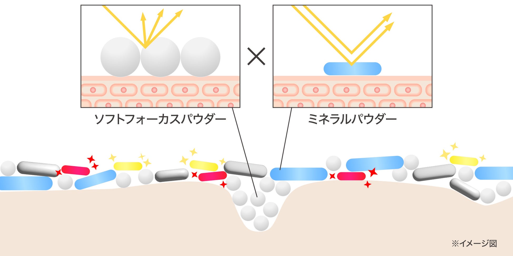 球状のソフトフォーカスパウダー*12と肌の屈折率に近い板状のミネラルパウダー*13を絶妙なバランスで配合することで、光の反射で毛穴をぼかしながら肌の凹凸を補正し、なめらかでフラットな肌に仕上げます。