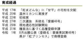 「紅プリンセス」は、愛媛県農林水産研究所果樹研究センターみかん研究所が育成したもので、品種名は「愛媛果試第48号」。開発過程にある2018年には西日本豪雨災害によって愛媛が被災し、多くのみかん畑やビニールハウスなどが土砂被害を受けました。