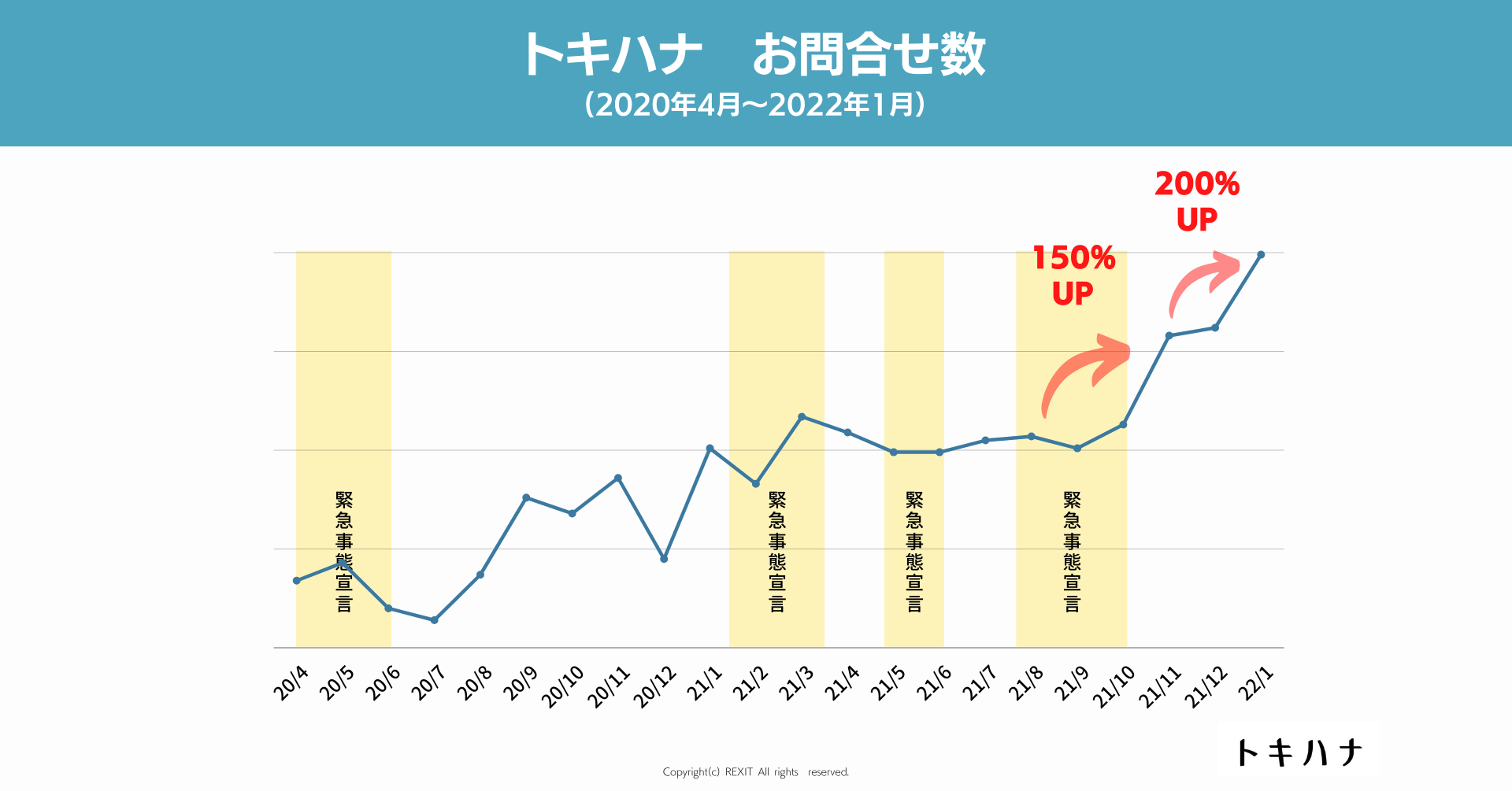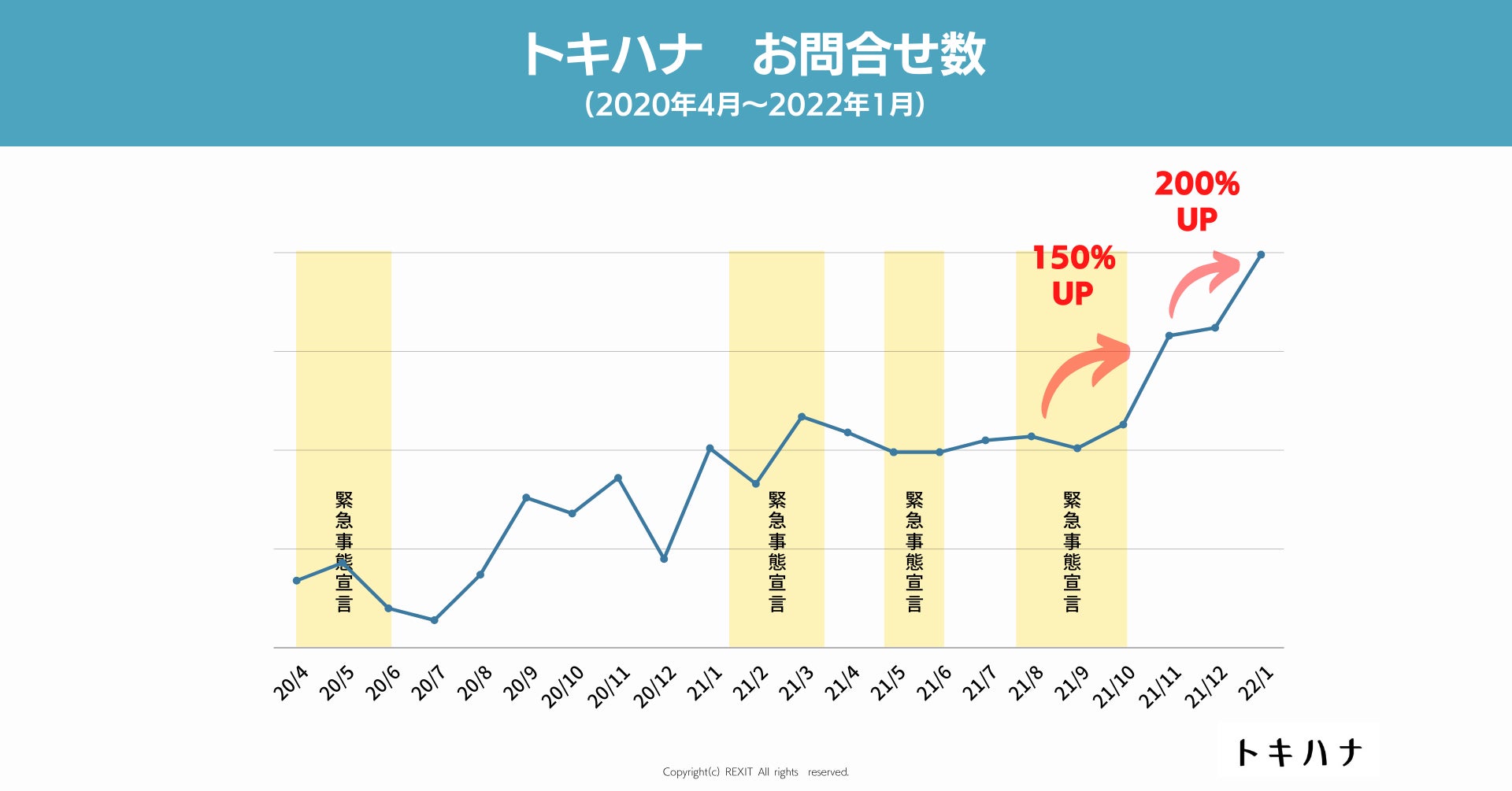 特に緊急事態宣言解除後、昨年の10月以降から非常に好調に推移しており、昨年11、12月とも従来の1.5倍に、1月はさらに2倍のペースで問合せ数が伸びております。(1月24日時点)