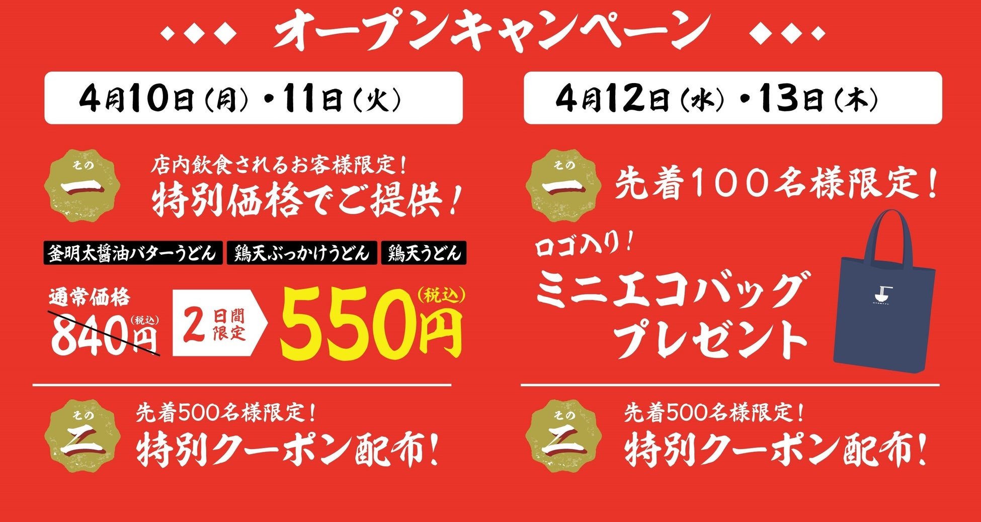 ~4月10日(月)から4月13日(木)の4日間限定でオープンキャンペーンを開催!定番のうどんメニューを特別価格でご提供&先着100名様にミニエコバックをプレゼント!~