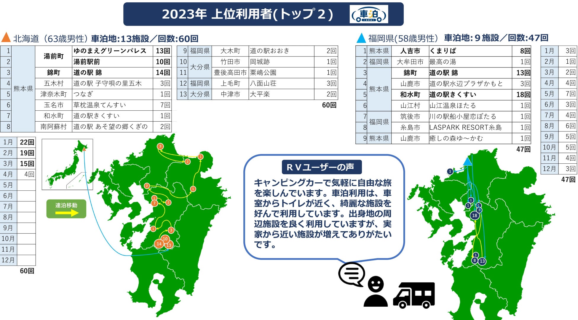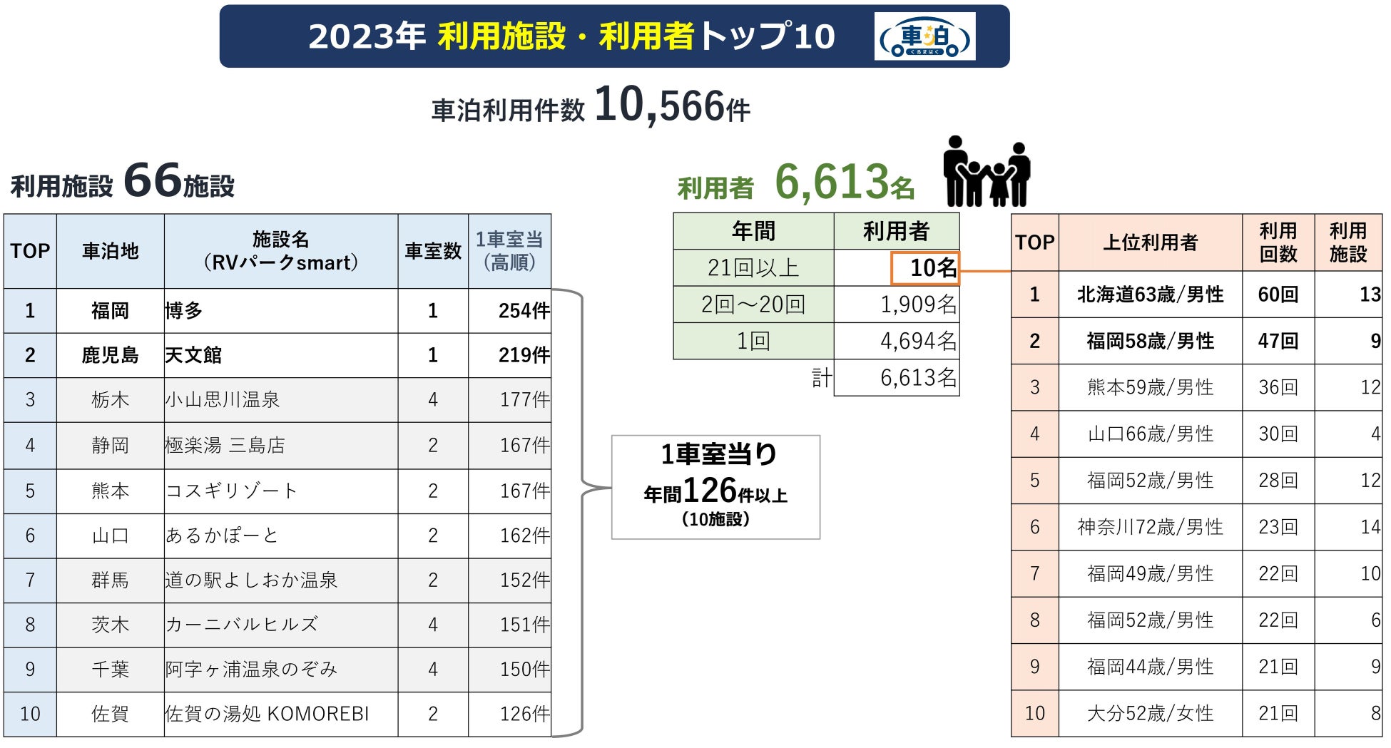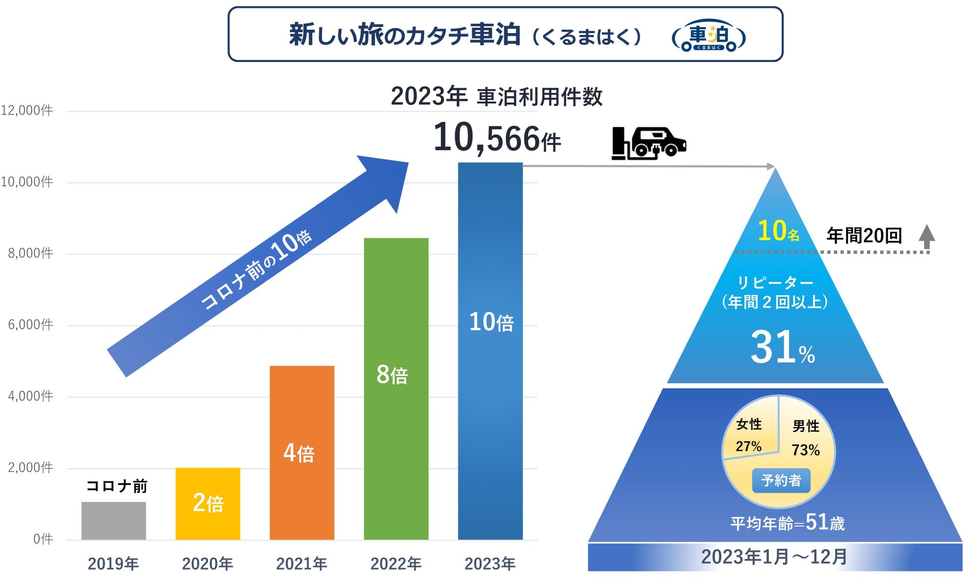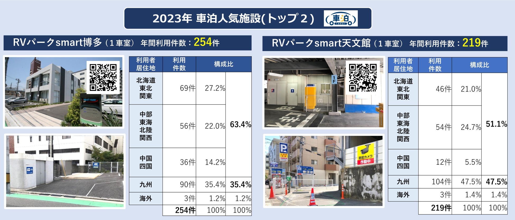 九州周遊観光活性化コンソーシアム(代表機関:トラストパーク株式会社 本社:福岡県福岡市博多区)が、「一極集中する都市から人の流れを創る」をコンセプトに、宿泊施設・二次交通が不足している地域などに提案・展開中の「車泊(くるまはく)・休憩駐車管理システム(RVパーク smart) 下部※①参照」について、2023 年の利用件数はコロナ前の10倍、年間1万件超となりましたので、利用データとRVユーザーの動向を公表いたします。