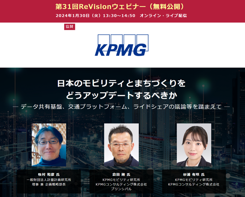 【無料WEBセミナー】KPMGモビリティ研究所、計量計画研究所から講師を迎え、「日本のモビリティとまちづくり」について無料ライブ配信 ― 1月30日(火)