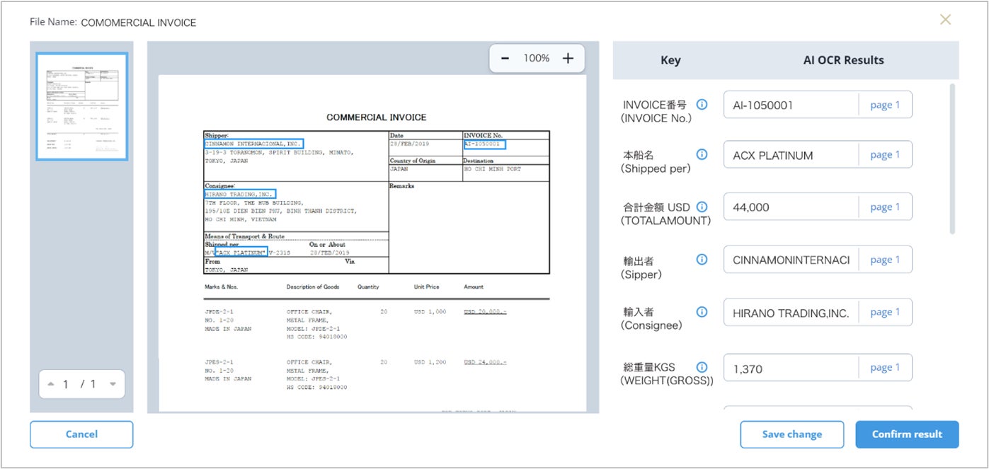 「Flax Scanner for 貿易書類」は、輸入時に発生する貿易書類(Invoice、包装明細書[Packing List]、船荷証券[Bill of Lading]など)を、シナモンAIが開発した専用AI-OCRモデルによって、90%以上(*1)の高精度で読み取り、テキスト化することが可能です。