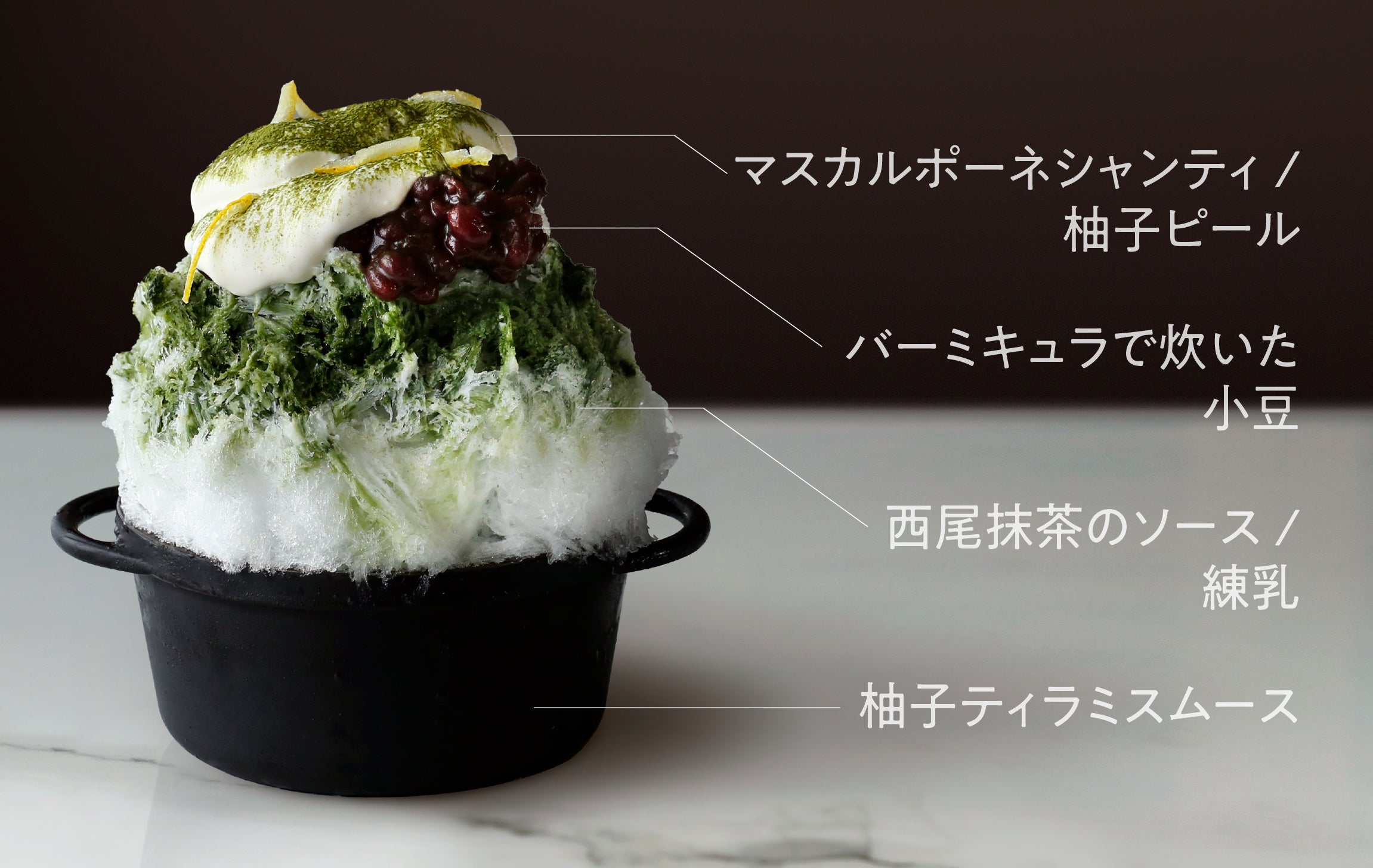 バーミキュラで炊き上げた小豆と愛知県西尾市でつくられた香りの良い抹茶の氷鍋です。上にのせた濃厚なマスカルポーネクリームとあわせて食べることで、まるでティラミスのような味わいに。下に食べ進んでいただくと柚子とマスカルポーネのムースが入っており、味の変化が楽しめます。
