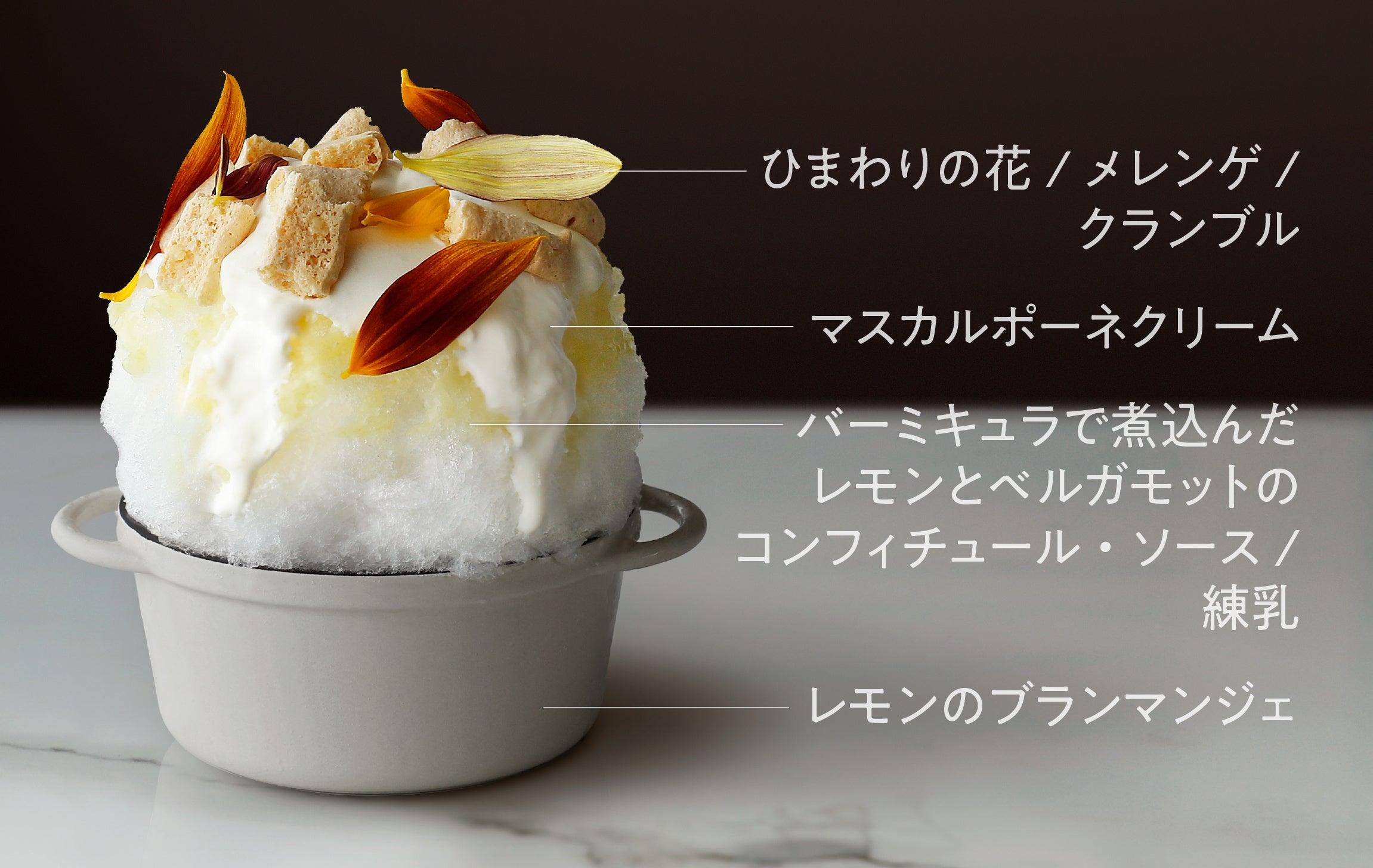 真っ白な氷鍋の中には、バーミキュラでじっくり煮込んだレモンとベルガモットのコンフィチュール、サクサクのクランブルがたっぷり。上にのせたマスカルポーネクリームとメレンゲをあわせることで、甘酸っぱくほろ苦いまさにレモンタルトのような味わいに。最後までスプーンが止まらないさっぱりとした氷鍋です。