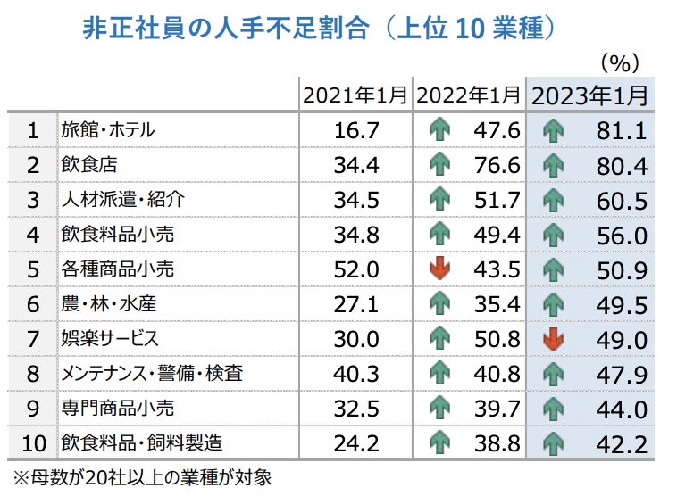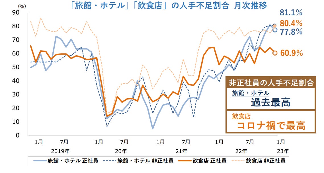 さらに、非正社員に関しても業種別の人手不足を感じる割合は「旅館・ホテル」「飲食店」がもっとも高く8割を超えています。これまで外国人人材で補ってきた部分も、コロナにより減った外国人労働者の戻りはまだ弱く、対応が難しい現状があります。