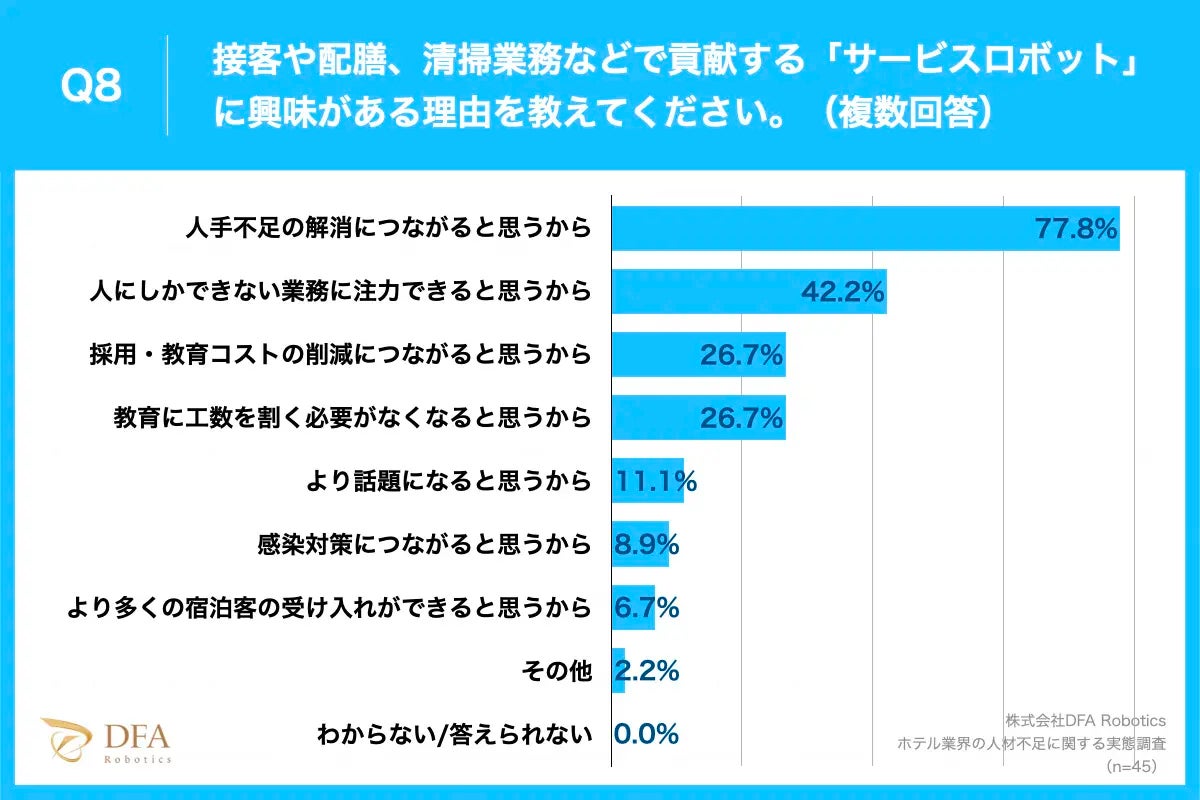 そのような現状の中、ホテルがサービスロボットに興味を示すもっとも多い理由は、やはり「人手不足の解消につながると思うから」です。さらに、人手不足が解消された結果、「人にしかできない業務に注力できると思う」「コミュニケーションが強化できそう」という副次的な効果を期待する声も見受けられています。